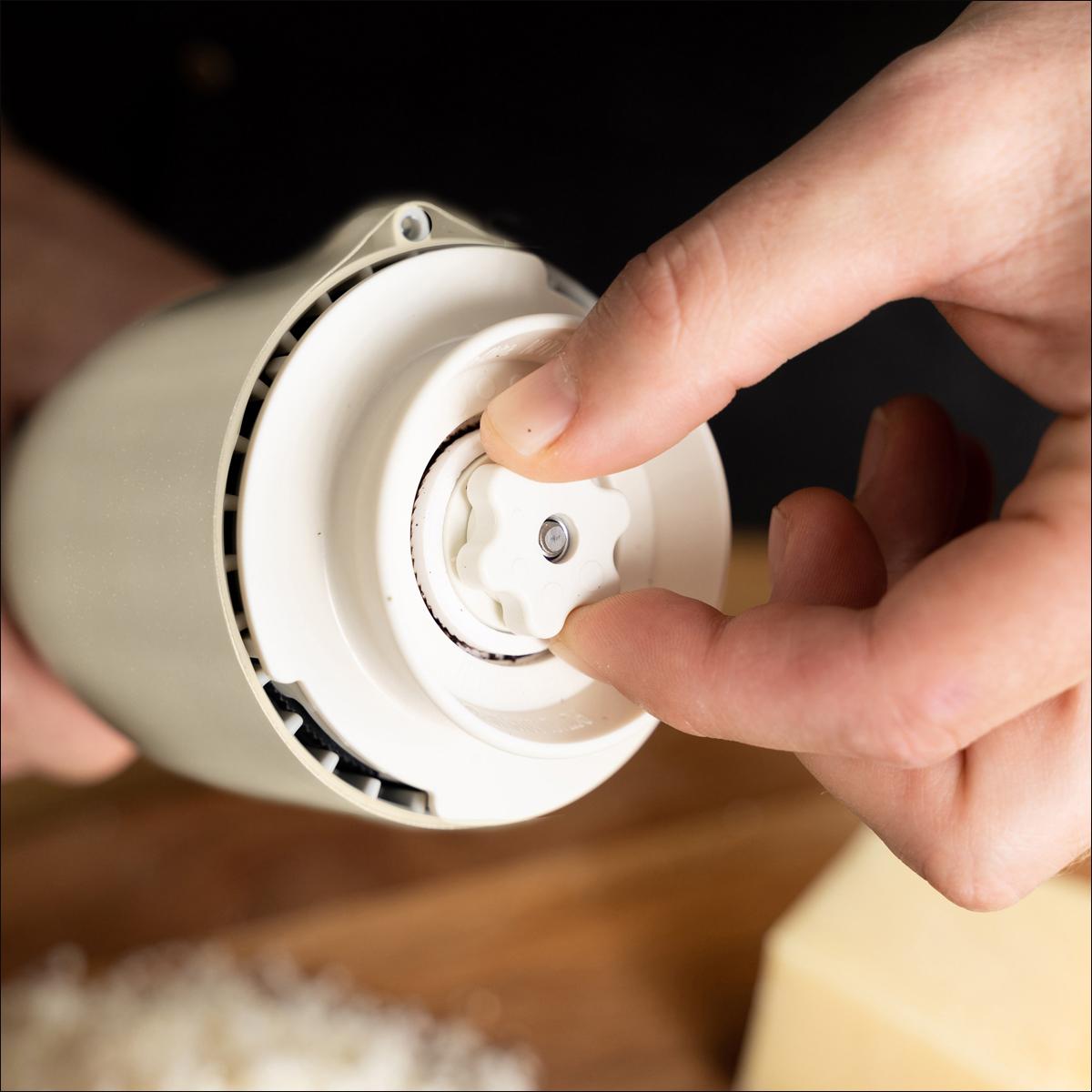 The rechargeable FinaMill features a 2-year warranty. Grinding is accomplished by pushing on the large button at the top of the mill. The FinaMill can also be used for grinding dried chopped garlic or onions, dried rosemary, and other dried herbs, as well as for grinding seeds. It's not intended for use with fresh herbs. 14" tall, 4" in diameter.