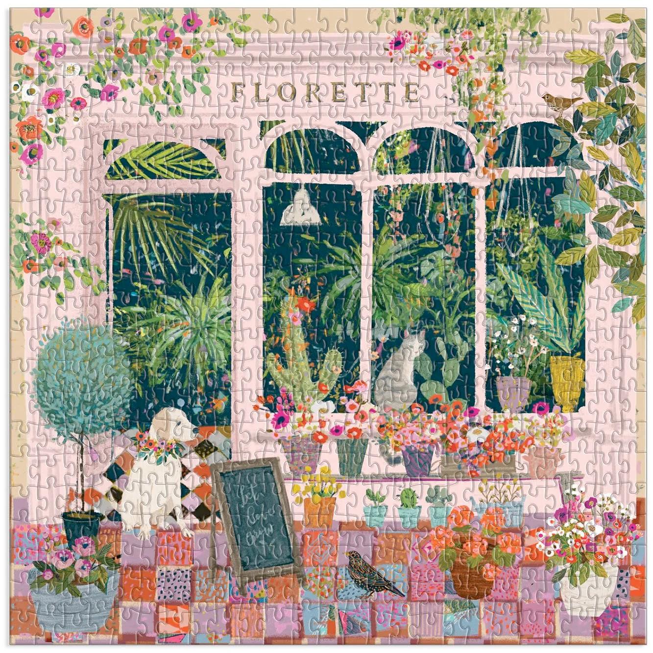 This 500-pc. puzzle features a charming illustration of an inviting plant shop by bestselling artist Victoria Ball. The ribbon-cut pieces are made of 90% recycled paper and are printed with water-based inks. The completed puzzle measures 20" x 20".