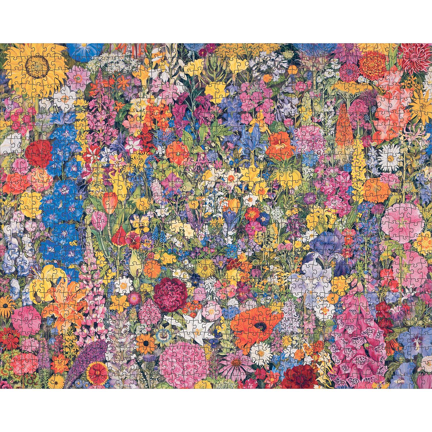 Rosalind Wise’s spectacular Flower Cycle—painted on a canvas nearly seven feet high and eight feet wide—overflows with colorful blooms so fresh and delicately detailed, one can almost sense their fragrance. Printed on high-quality matte art paper for superior color, crisp details, and no glare, with a base of ribbon-cut, recycled board for snug fit and minimal dust. When completed, the 1,000-pc. puzzle measures 25” x 20”.