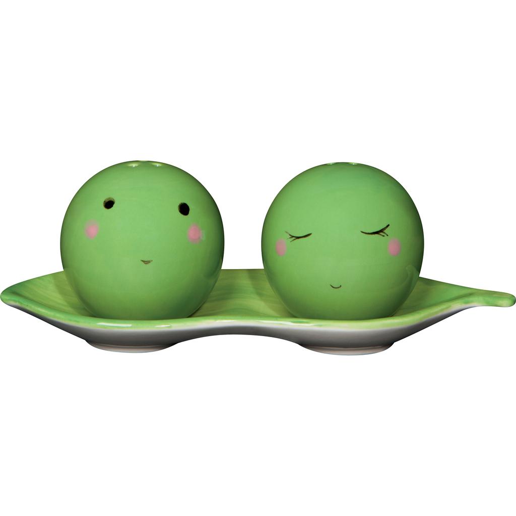 Like two peas in a pod, these delightful shakers will charm their way onto your table, coaxing a smile out of anyone. The 3-pc. set is made of durable stoneware, with a tray that measures 7" x 2". Hand washing recommended.