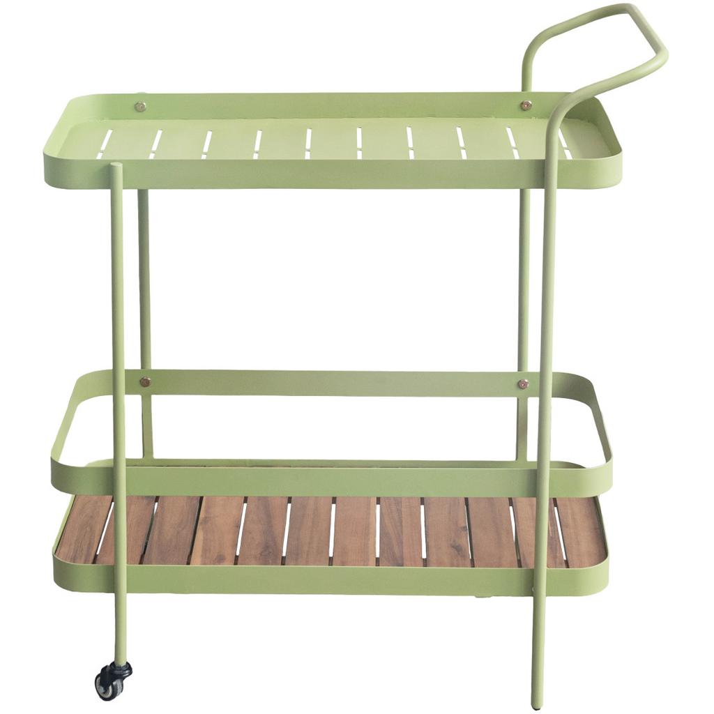 A versatile and charming piece for use indoors and out, it can be a drinks server, a dinner cart, or transport for pots, planters and garden supplies. It's made of steel with a slatted, solid-acacia bottom shelf and features casters on two legs. 29.5" x 17" x 36" high.