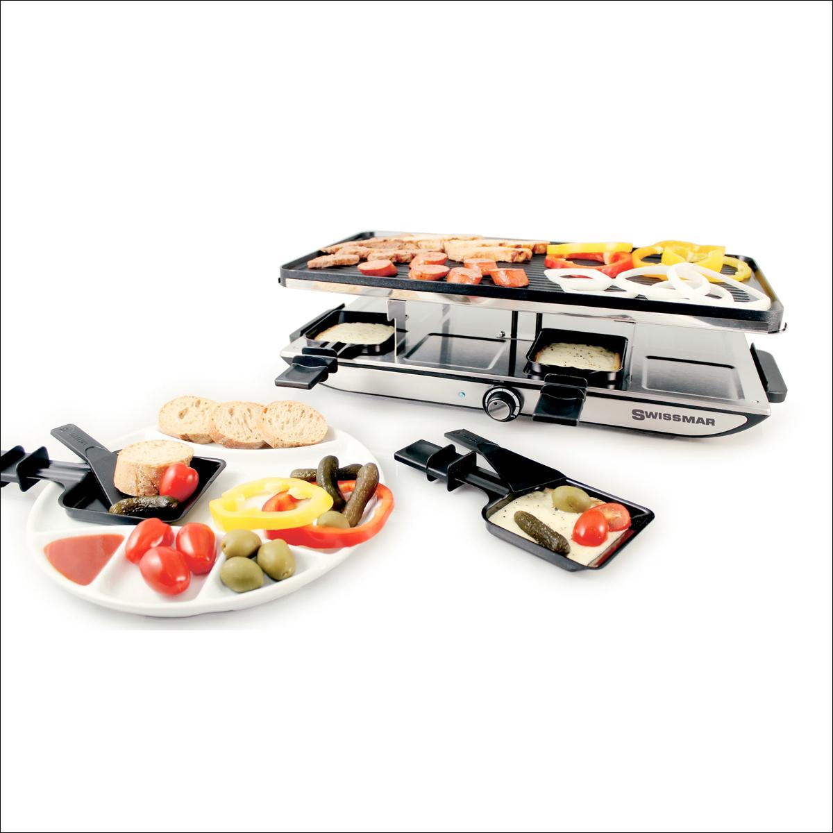 The Geneva electric raclette grill will do all that, plus the non-stick aluminum reversible grill/griddle top is excellent for grilling meats and veggies, with the smooth side ideal for cooking sandwiches, eggs, bacon, pancakes, and dessert crepes. The grill features a variable heat control and a 1450-watt heating element for quick response. The Geneva raclette grill features a sleek, modern design in stainless steel and black, and includes 8 heat-resistant spatulas and 8 coupelles, or raclette dishes. The reversible, non-stick aluminum, grill/griddle top lifts off for easy cleaning. Complete with instructions and recipes, 1-year warranty.