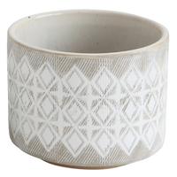 This rugged stoneware planter is beautifully finished in a tile-like pattern. 5” in diameter, 4.25” high to hold a 4”-dia. planter pot.