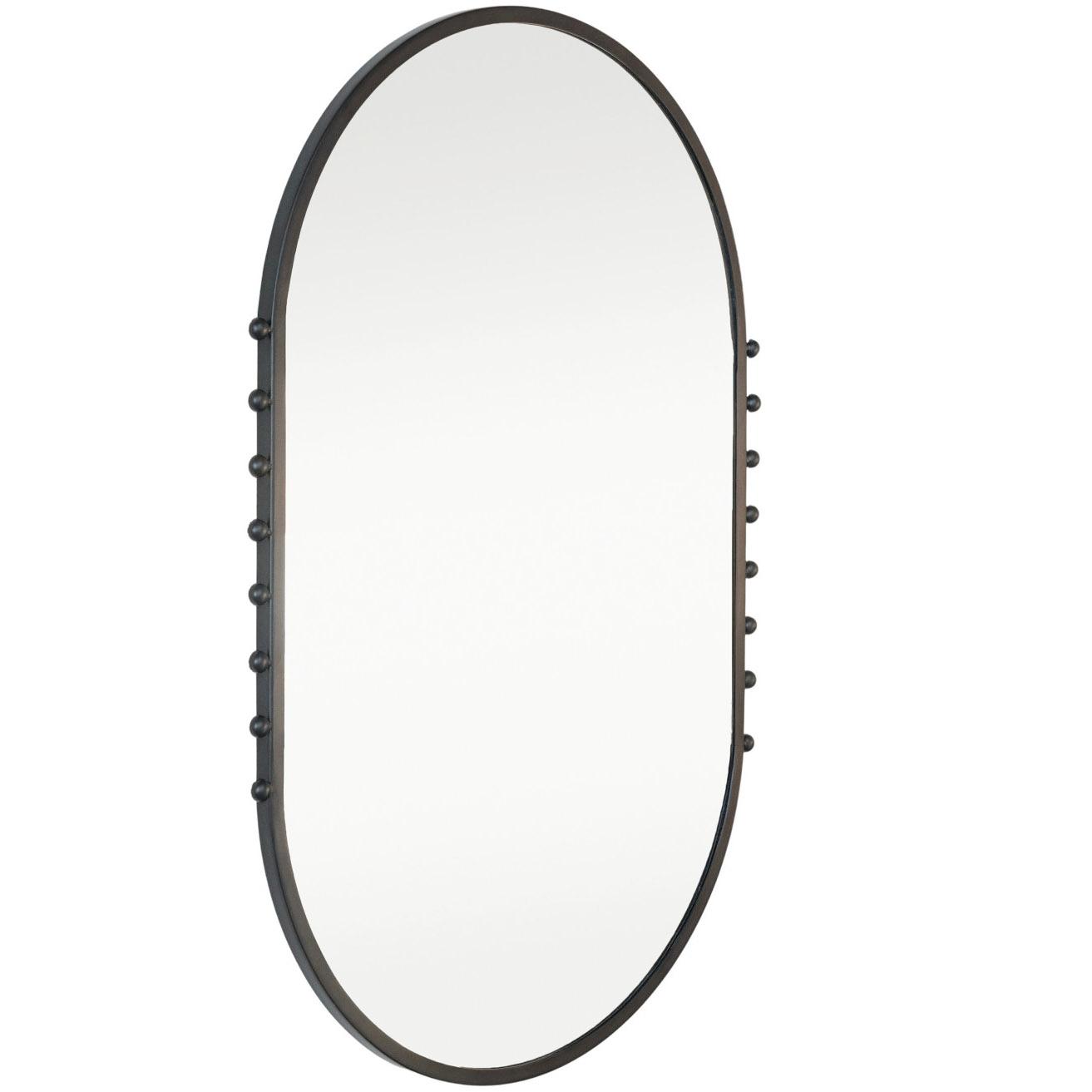 The industrial-style Germaine mirror features a powder-coated, matte black metal frame that features eight metal balls on each side. It measures 24.25” wide and 35.5” tall.