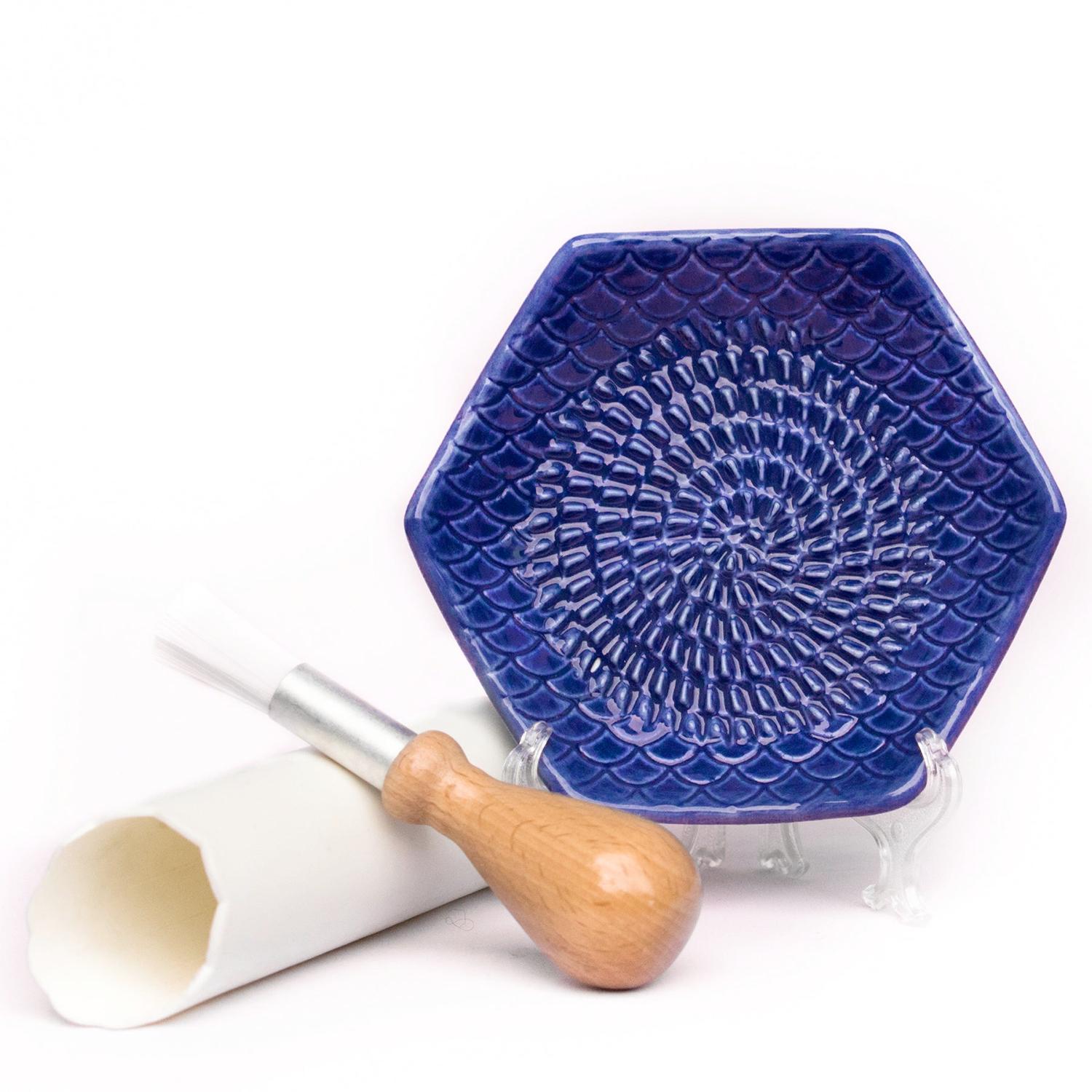 Perhaps the easiest and fastest way to grate, the ceramic Grate Plate will not cut your fingers or knuckles like traditional metal graters can do. The grating surface is easy on your hands, making it finger-friendly. Made of durable, dishwasher safe stoneware the Grate Plate is easy to clean. Use it to finely grate garlic, ginger root, nutmeg, chocolate, pickles for relish, hard cheeses, and more into a fine puree that unlocks all the flavor. The Grate Plate comes with a silicone garlic peeler that removes those pesky garlic skins by simply rolling a garlic clove back and forth with gentle pressure. Also included is a brush for removing grated food from the plate. The Grate Plate measures 4.5” x 4.5”.