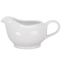This large-bellied gravy boat is made of durable porcelain, safe in the microwave and dishwasher. It measures 7.5" long and has a capacity of 19 ozs.