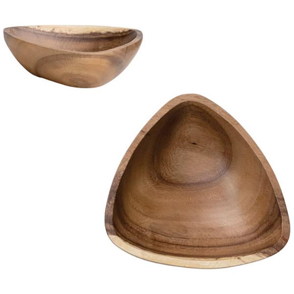 The beautiful grain of acacia is highlighted by the distinctive shape and smooth feel of this triangular bowl. 6" x 6" x 2" high.