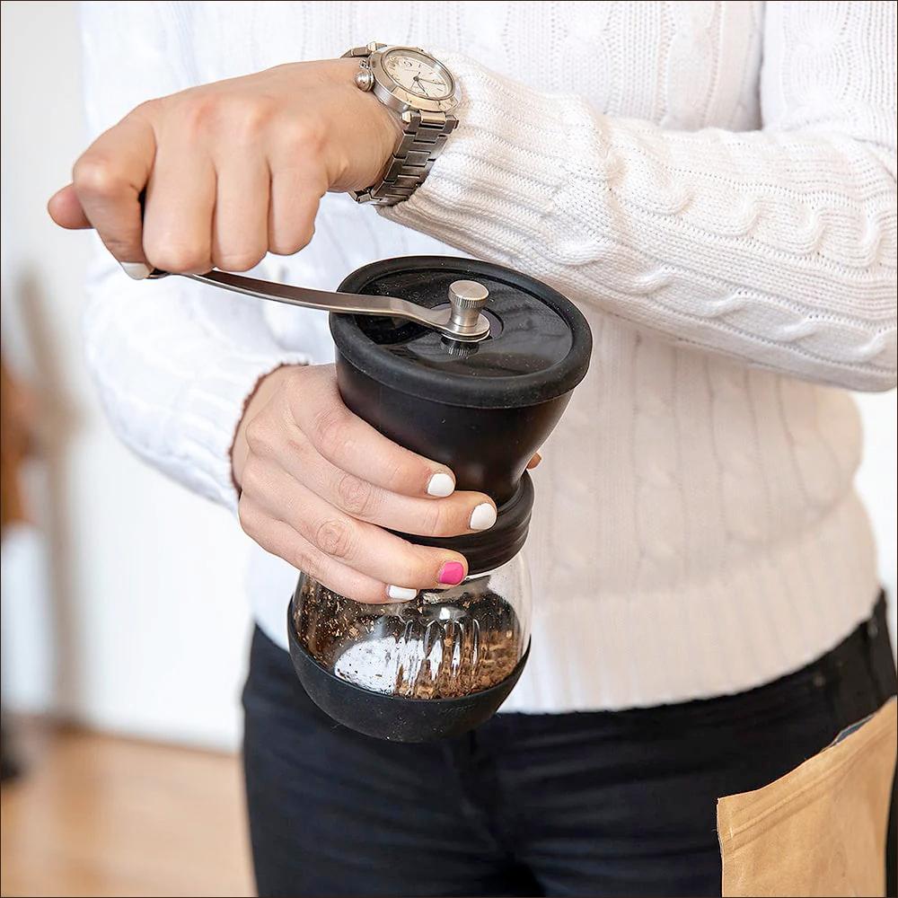 If you're looking for an affordable burr coffee grinder, one that you can easily take on the go, the Hario Skerton Plus is the answer. It features precision, ceramic burrs that are easily adjustable to grind for brewing methods ranging from cold brew and French press to almost espresso. The ceramic burrs shave the beans giving you a consistent and even grind, and the heat generated from grinding will not be transferred to the coffee beans, ensuring that the flavor of your coffee grounds will not be negatively affected by the grinding process. The Skerton Plus will hold 3.5 ozs. of beans, so you can grind for multiple servings, and the crank handle detaches for compact storage and packing. 9.25" tall, all the parts are dishwasher safe.