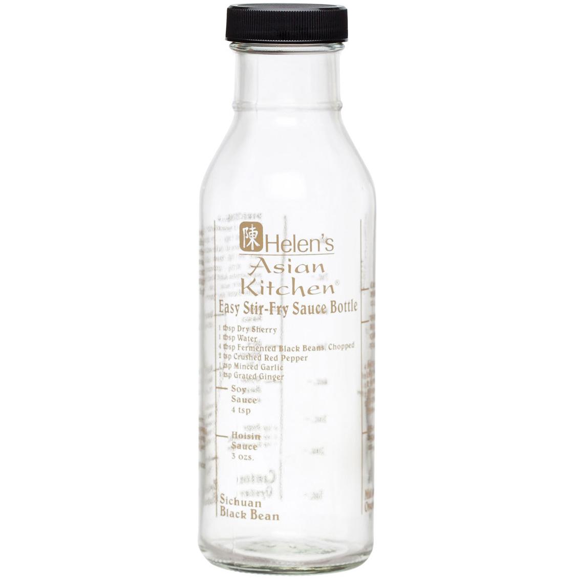 This handy bottle was designed by Helen Chen to measure, mix, serve and store stir-fry sauces quickly and easily. It features four authentic Asian stir-fry sauce recipes printed right on the glass bottle, with permanent markings that won't fade or wear off. Each recipe shows the precise ingredient measurements clearly for Mandarin Orange sauce, Canton Oyster sauce, Beijing Hoisin sauce, and Sichuan Spicy Black Bean sauce. So, all you need to do is simply measure ingredients right into the bottle, cap, shake and pour. 13-oz. capacity, dishwasher safe.