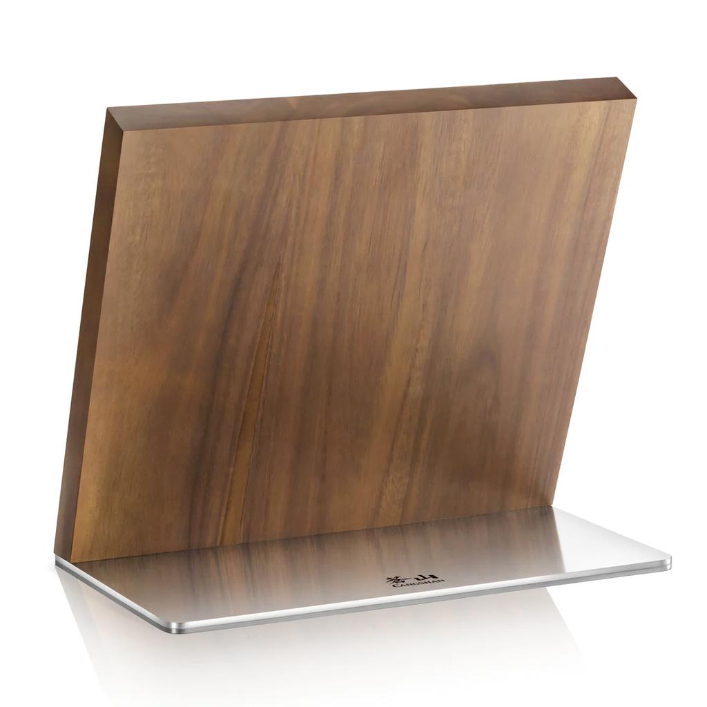 Cool, huh? A brilliant piece of minimalist design, the Hua knife "block" from Cangshan features powerful magnets embedded in acacia wood to securely hold 10 to 15 knives, depending on the size of the blades. The base is made of stainless steel and the entire design lets you not worry about having the right size slots for your knives and the knives you might add. The Hua knife storage unit measures 11" wide, 9.9" tall and 6.7" deep.