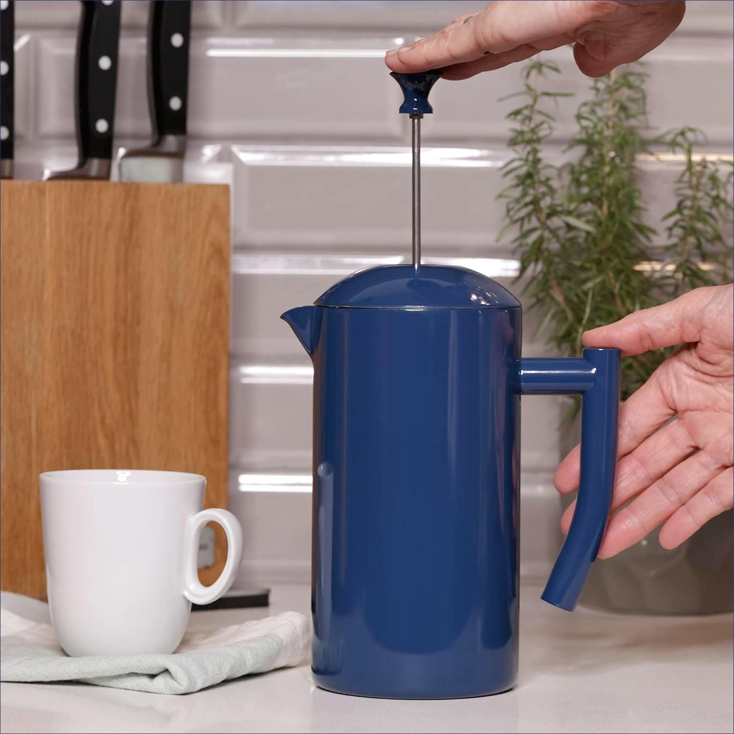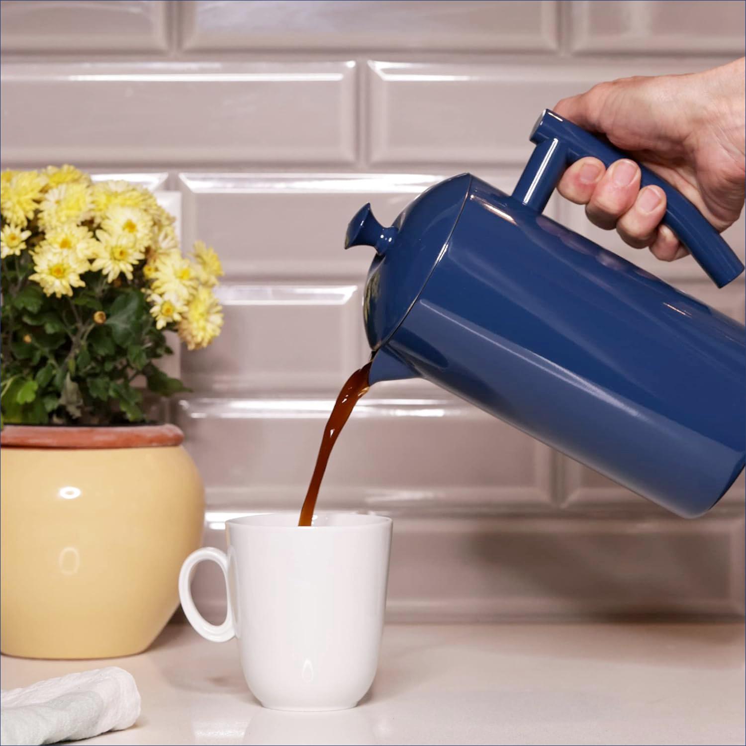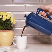 Looking for a French press that keeps coffee hot? This colorful 34-oz. press is made of double-wall stainless steel with an insulating vacuum between the layers. This construction keeps fresh-brewed coffee far hotter for far longer than a glass French press, up to four times longer, in fact. And, the brilliant finish looks great, too. Inside is a double mesh filter system to keep grounds out of your cup. This top-quality press lets you enjoy your French press coffee at your leisure without having to re-heat it.