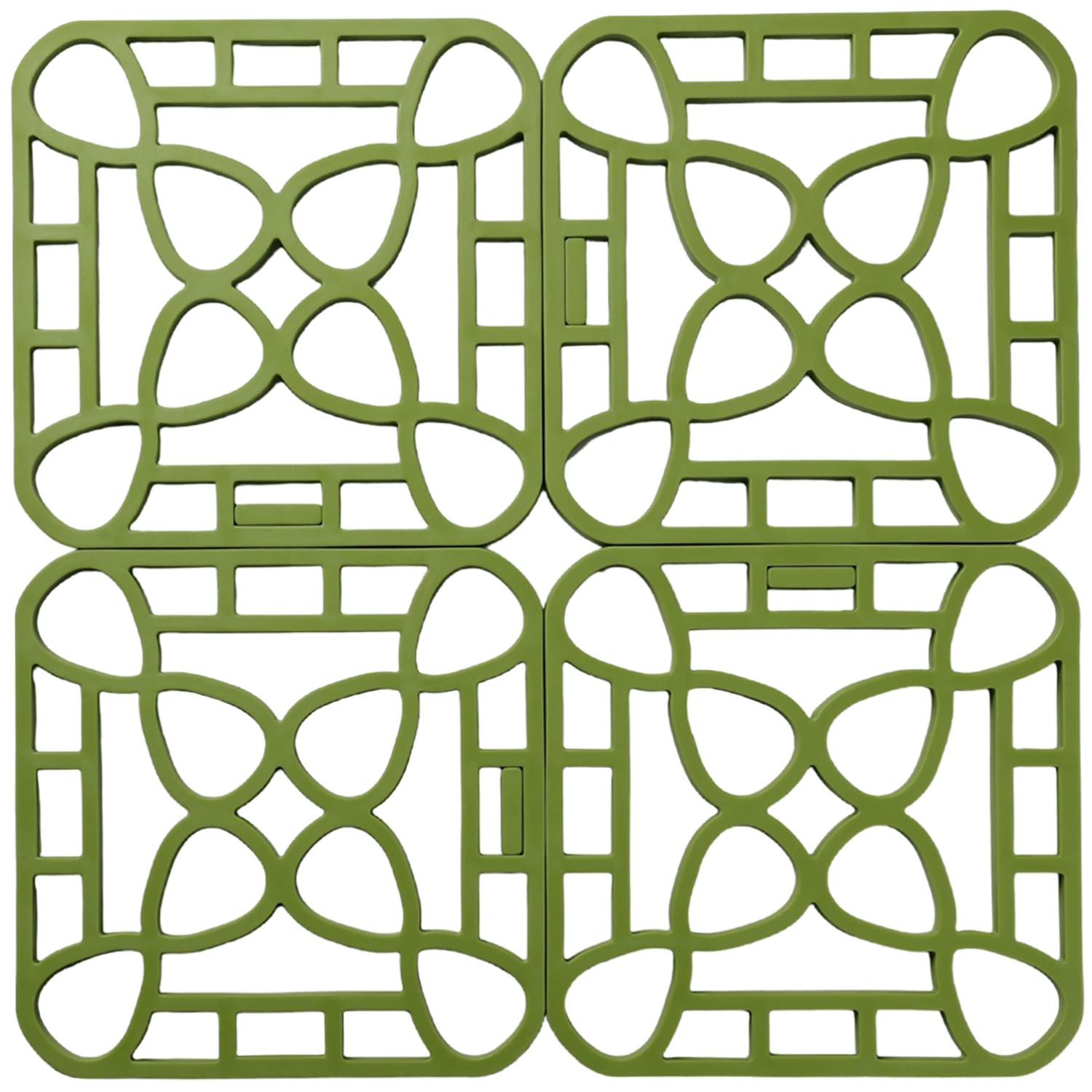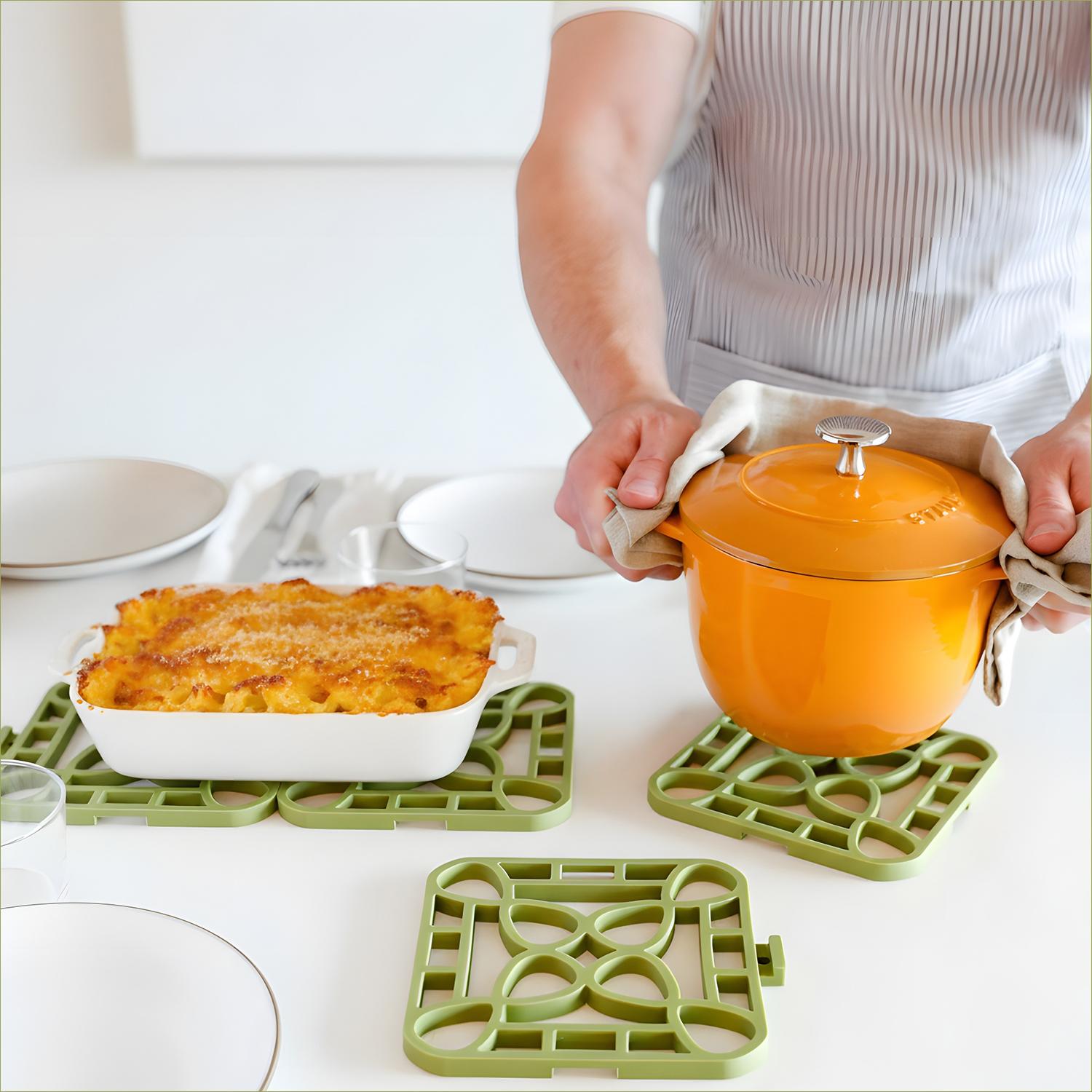 What a great idea!…a rugged silicone trivet that can multiply to your heart’s content. Measuring 6” X 6”, this rigid silicone trivet is heat-resistant to 450° F and soft enough to not mar table surfaces. It’s worry-free protection against heat in the kitchen and on the table. And, it’s dishwasher safe. Plus, the trivets can interlock securely with the built-in clips if you need larger protective surfaces: in twos, threes, fours, or more; you can even be wild and mix the five different colors.