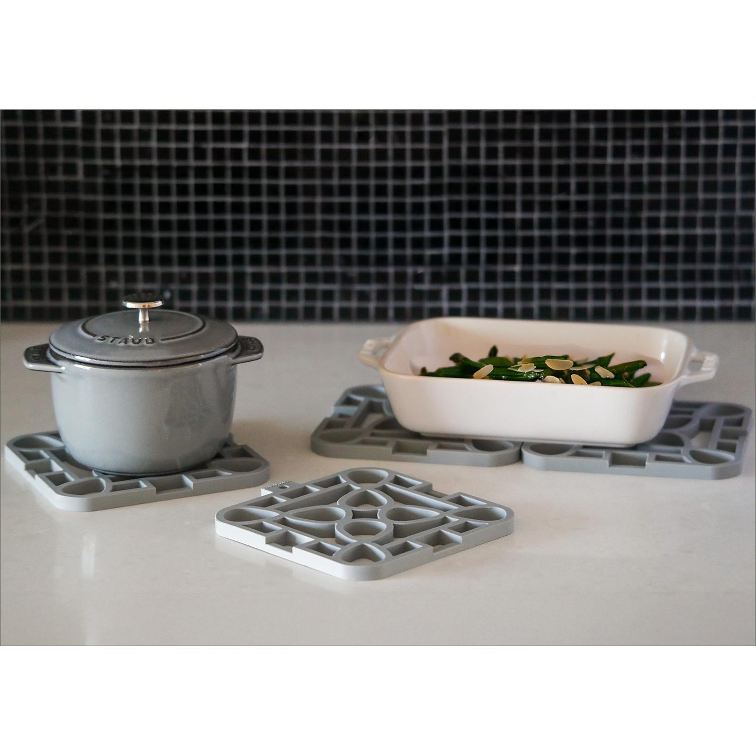 What a great idea!…a rugged silicone trivet that can multiply to your heart’s content. Measuring 6” X 6”, this rigid silicone trivet is heat-resistant to 450° F and soft enough to not mar table surfaces. It’s worry-free protection against heat in the kitchen and on the table. And, it’s dishwasher safe. Plus, the trivets can interlock securely with the built-in clips if you need larger protective surfaces: in twos, threes, fours, or more; you can even be wild and mix the five different colors.
