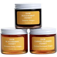 Sample the work of bees from three distinct Oregon environments, 2 ozs. each of Jacobsen raw honey from Portland farmlands, the Willamette Valley and northeastern Oregon in the Columbia Basin. Raw carrot flower honey, raw blackberry honey, and raw buckwheat honey are all unblended single-origin honeys that are untreated, unheated and not ultra-filtered. Sweet!