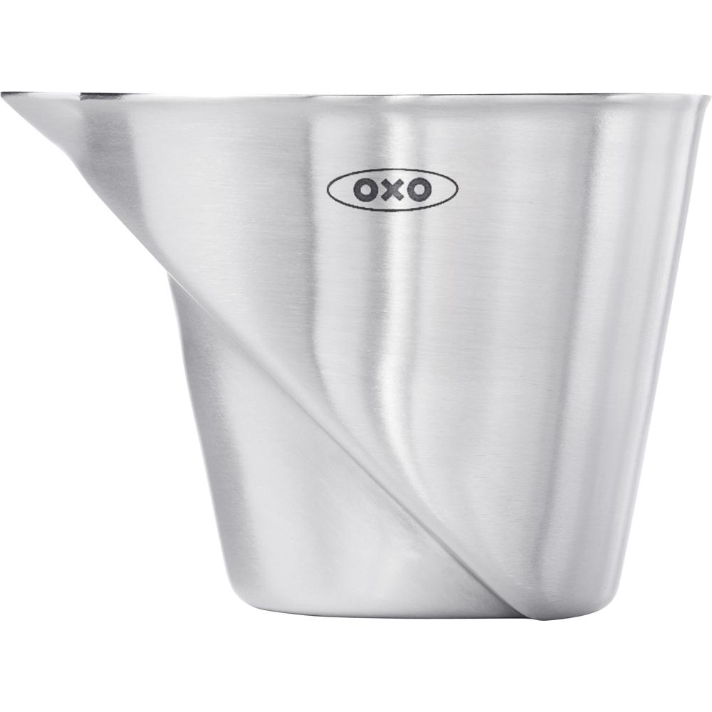 OXO's revolutionary angled measuring cups feature a patented angled surface that lets you read measurement markings by looking straight down into the cup, eliminating the need to fill, check and adjust the amount of liquid you are measuring. The stainless mini cup/jigger features ounce and tablespoon markings for measuring small amounts of liquid ingredients like vanilla extract, lemon juice, or soy sauce. Or, try it at the bar for mixing drinks; it makes a great jigger, with measures from .25 oz. to 2 ozs. And keep a spare on hand for non-food uses like measuring laundry detergent, plant food and more. Dishwasher safe.