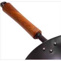 No break-in needed, this classic carbon-steel stir-fry pan is ready to go out of the box. This pre-seasoned surface can be built upon to create a dark, rich patina and natural non-stick surface; just hand wash the pan using only hot water. Carbon steel is the classic material for high-heat, stir-fry cooking, able to withstand and transfer heat quickly and evenly, and light enough for easy handling. The removable wood handle means you can cook without a hot pad, even at high temperatures. This stir-fry pan measures 12" in diameter, 5.25" high, and 20.4" through the handle, and has a capacity of more than 6 qts.