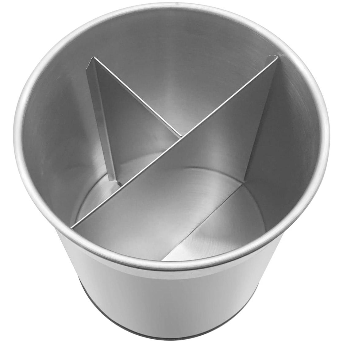 This sleek, stainless-steel utensil holder has it all; it rotates on a stable, non-slip base to make it easy to grab the tool you need, and it features a removable, 3-compartment divider to keep utensils from getting tangled up. Remove the divider, and you hold even more tools. Not only that, this is a big utensil crock, measuring 7" in diameter and 7.5" tall. Made of brushed stainless-steel with a polished band around the top.