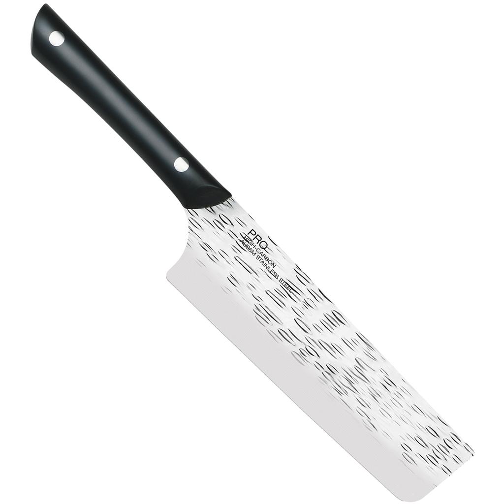 Each Kai Pro knife features a blade made from Japanese AUS6M steel, which extends to the end of the handle for a balanced, full-tang construction. Kai Pro knives perform differently than western-style knives, which are usually sharpened at a 20-25 degree angle. Kai Pro takes a finer, 16 degree edge for smoother, sharper action. This Japanese-style hammered finish on the blades serves a function as well as giving a dramatic appearance. The hollow cavities form tiny pockets of air, helping release food from the steel. In addition, the finish reduces blade drag while cutting. The handles on Kai Pro knives are made from a high-performance thermoplastic that is extremely rigid, to add strength and comfort during food prep. As you cut, your hand will fit perfectly around the durable, riveted handle. This pro-level grip offers a lifetime of performance for home cooks and is equally ready for the hectic tasks of a commercial kitchen.