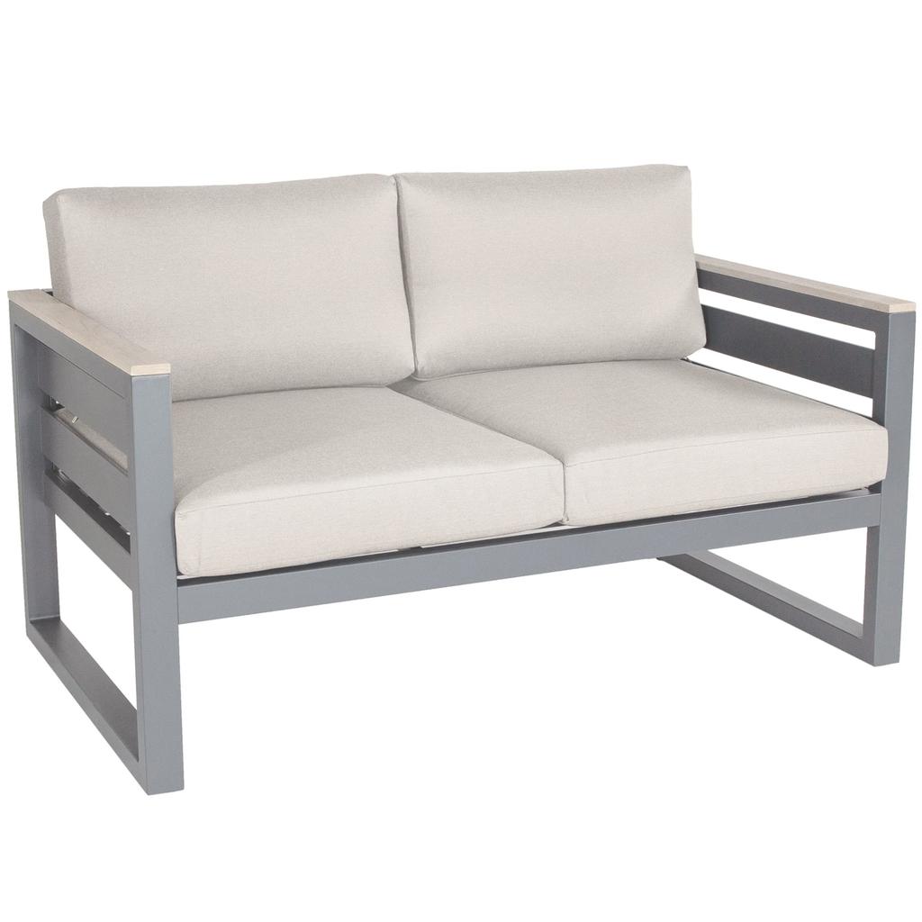 Striking design and high-quality materials characterize this contemporary outdoor dining chair from Kettler. The frame is made of square-section aluminum tube, for light weight, strength and resistance to corrosion; the frame is powder-coated in a sleek, matte-grey finish; the armrests are solid teak; and all the hardware is stainless steel.. The wood armrests are FSC-certified teak, given a light-grey wash. Underneath the seat cushion is a textile sling suspension system for relaxing comfort, while the cushion itself is made of high-density foam covered in 100% acrylic Sunbrella fabric, the standard for outdoor use, resistant to fading and moisture.