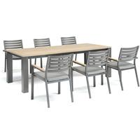 Striking design and high-quality materials characterize this contemporary outdoor dining table from Kettler. The frame is made of square-section aluminum tube, for light weight, strength and resistance to corrosion; the frame is powder-coated in a sleek, matte-grey finish and all the hardware is stainless steel.. The wood top is made from FSC-certified teak, that is given a light-grey wash. The Elba dining table measures 87" x 40" x 30" high.