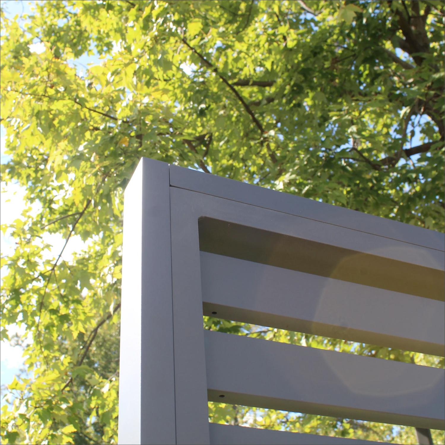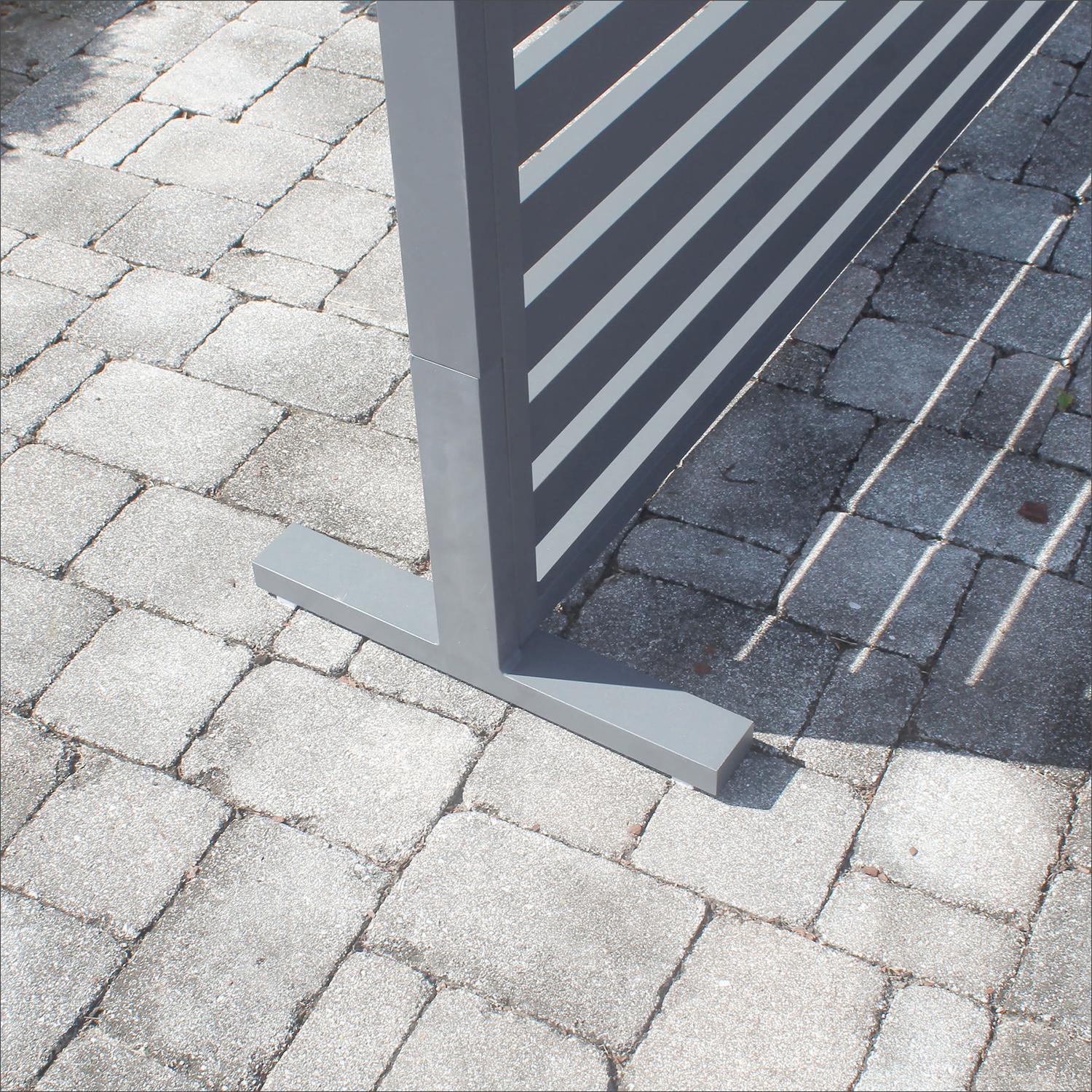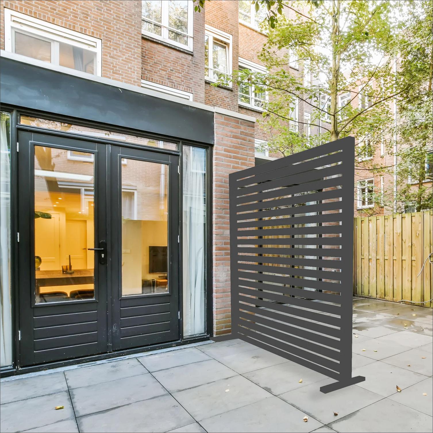 Need some privacy in your outdoor space? Or, want to divide a room indoors? This indoor/outdoor divider from Kettler works in either environment. It features a powder-coated aluminum frame and slats along with stainless-steel fasteners, and is finished in a durable, waterproof, UV-resistant, charcoal grey color. Ground anchors are included for increased stability outdoors. 74” wide, 74” high and 18” deep through the legs.