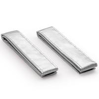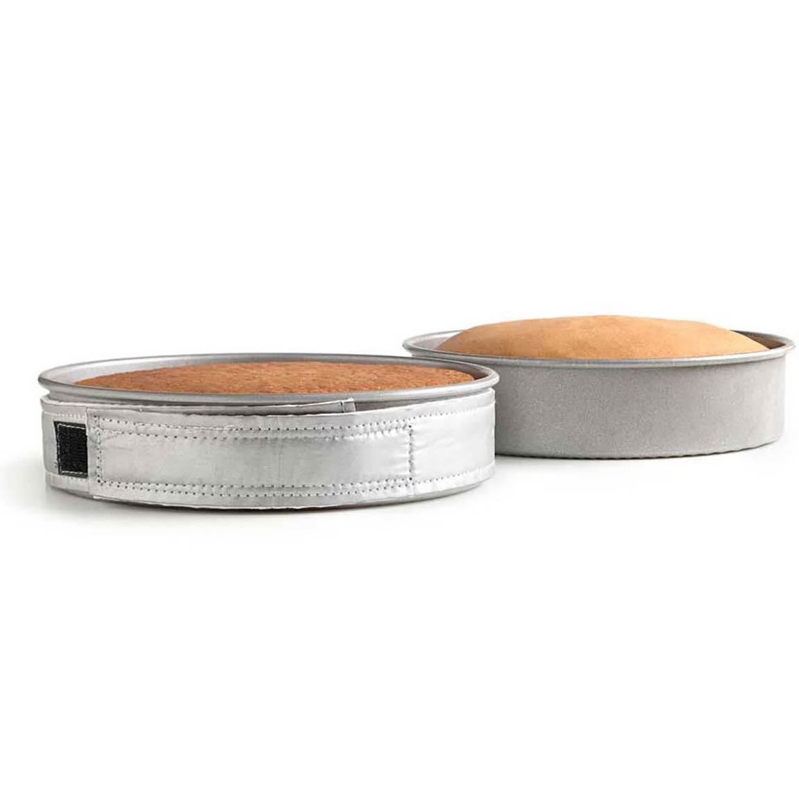These great baking tools conduct heat evenly to help prevent cakes from doming, cracking, and over-baking, creating smooth, level layers that are easier to stack, ice and decorate. Made from polyester, cotton, and Velcro, each strip is heat safe up to 400° F. The strips adjust easily with a Velcro closure to fit straight-sided 8”and 9” round cake pans securely, creating a consistent baking environment that encourages flat results without trimming away any domed top. To use, soak the strips in water for 15 minutes, squeeze out any excess, and wrap them snugly around the pan before adding your batter. After baking, allow the strips to cool completely before removing, then wipe clean as needed. Each strip measures 32” x 1.5”.