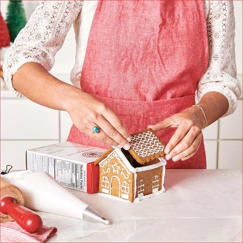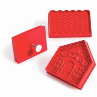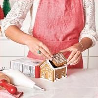 This kit from the King Arthur Baking Company makes it easy to create a real gingerbread house. The 3-pc. set includes 1 each front/back, roof, and side cutters that cut out the 2 sides, 2 roofs, and 2 fronts/backs that are needed to make the house. When assembled, the house measures 4" x 4.5". The spring-loaded lever in each cutter cuts, stamps, and releases detailed shapes using roll-out cookie dough from your favorite recipe. Chill the dough at least 30 minutes before rolling and dust the cutters in flour to keep dough from sticking between cuts. Once the cut house cookie pieces are baked and completely cooled, assemble them into a house using icing to hold them together, then decorate to your heart's content.