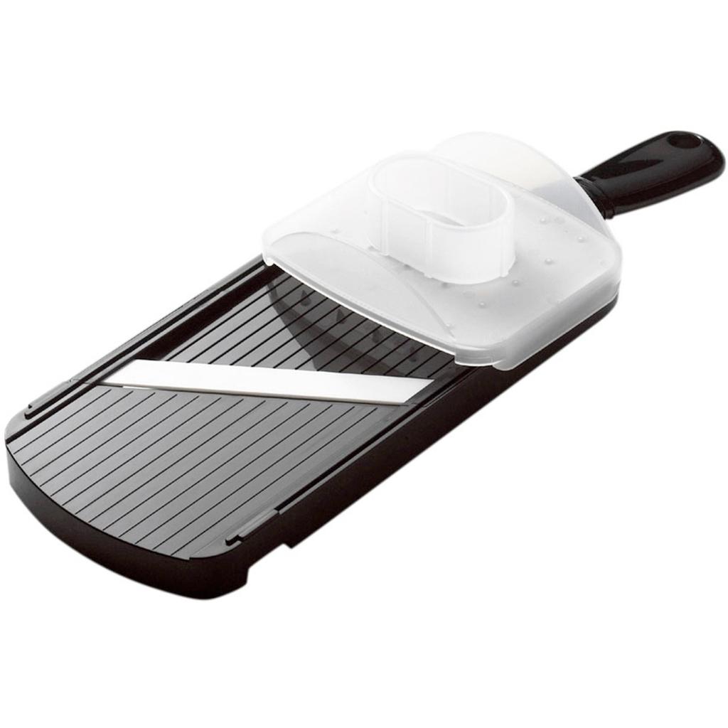Thanks to the double-edged, advanced ceramic blade, this Kyocera mandoline does all the work in half the time. It quickly and neatly produces piles of 2mm-thick slices of fruits and vegetables, both when pushing and when pulling. Kyocera's ultra-sharp, proprietary, zirconia blade will maintain its edge up to 10 times longer than a steel blade, and is rust-proof and resistant to acids. A protective hand guard holds the food and protects your fingers, while handy corner notches let you secure the mandoline to a bowl to catch the slices. 10.6" x 3.6", dishwasher safe.