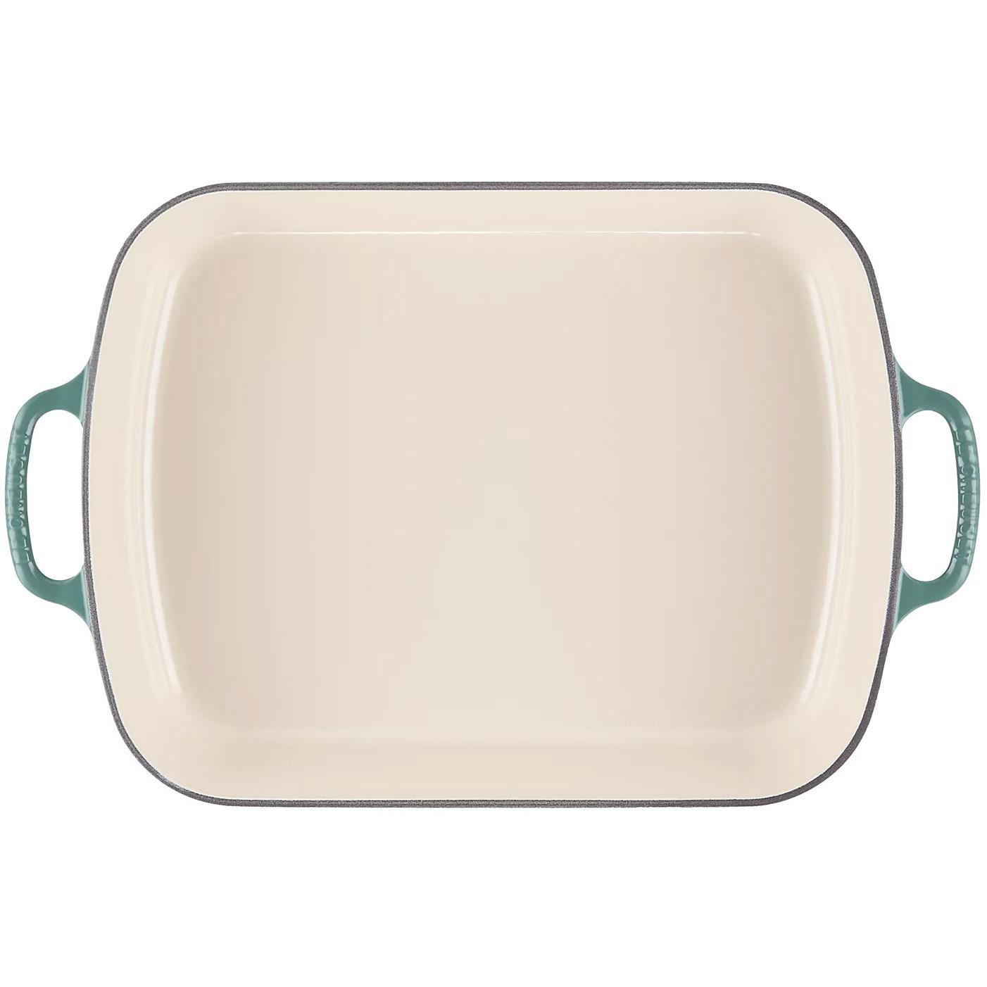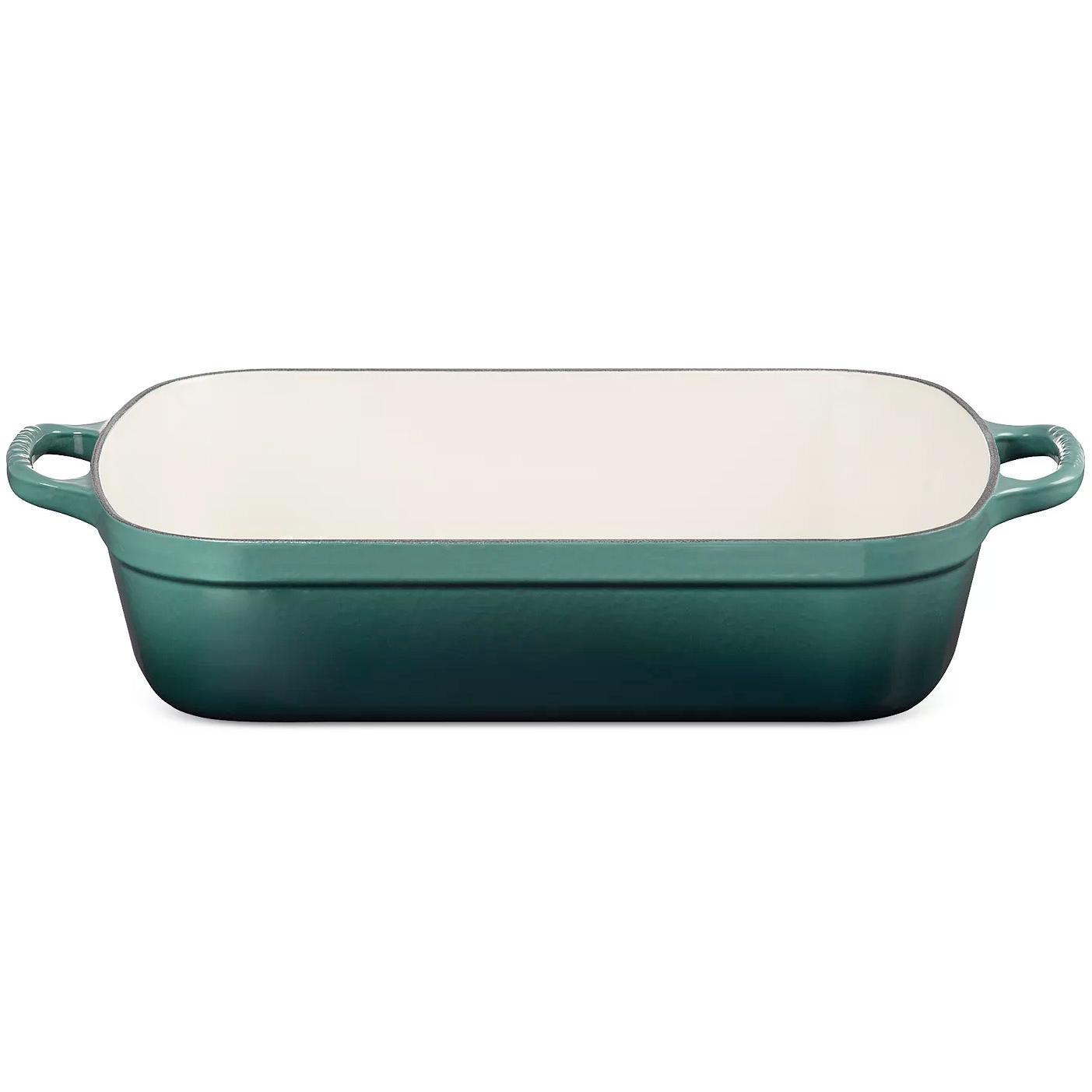 Le Creuset’s big roasting pan is perfect for roasting meats, poultry and vegetables, as well as making family-sized casseroles and side dishes. It measures 15.8” x 10.2: x 3.3” with a capacity of just over 5 qts. The design features a low-profile shape that’s optimized for oven roasting, and a generous cooking surface for making gravies and sauces on the stovetop. The wide loop handles make it easy to maneuver from stove to oven to table for easy serving. The porcelain enamel finish resists staining, chipping and cracking and is safe for metal utensils. We recommend hand washing.
