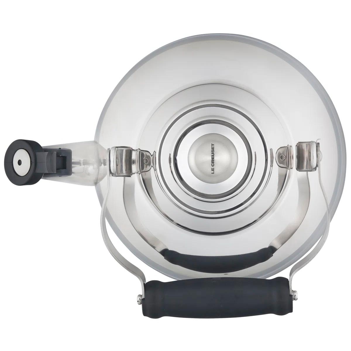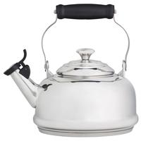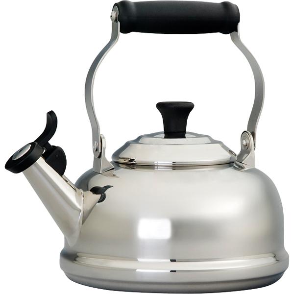 Traditional styling combined with modern materials make Le Creuset kettles a welcome addition to any stovetop. Their unique, locking handles and phenolic knobs make lifting, pouring and cleaning easy. The Le Creuset Classic kettle is made of quick-and-even-heating carbon steel with a enamel finish. 1.8-qt. capacity with a whistle alert when the water boils