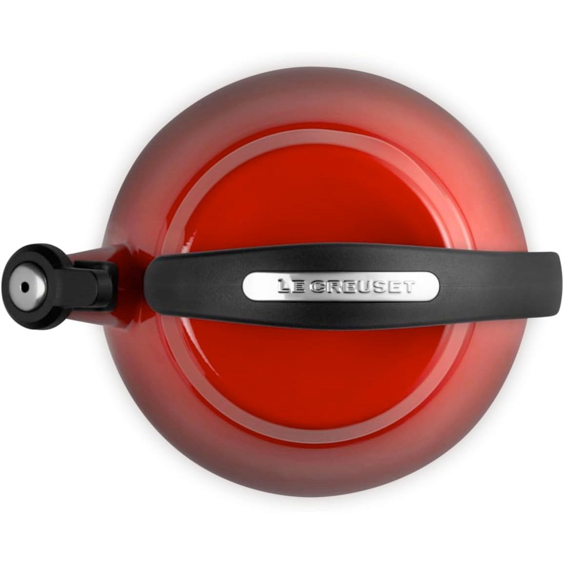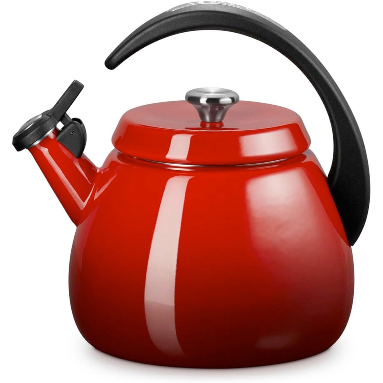 Le Creuset’s first new kettle in over a decade, the dynamic Cloche kettle features a balanced, stay-cool halo handle and a stainless-steel knob. Made of quick-heating, lightweight, premium carbon steel, the Cloche kettle has a capacity of 2.2 qts. and features a single-tone whistle, that easily flips open for pouring, to alert you to your boiling water. The Cloche kettle performs beautifully on any stovetop, including magnetic induction. Hand wash.