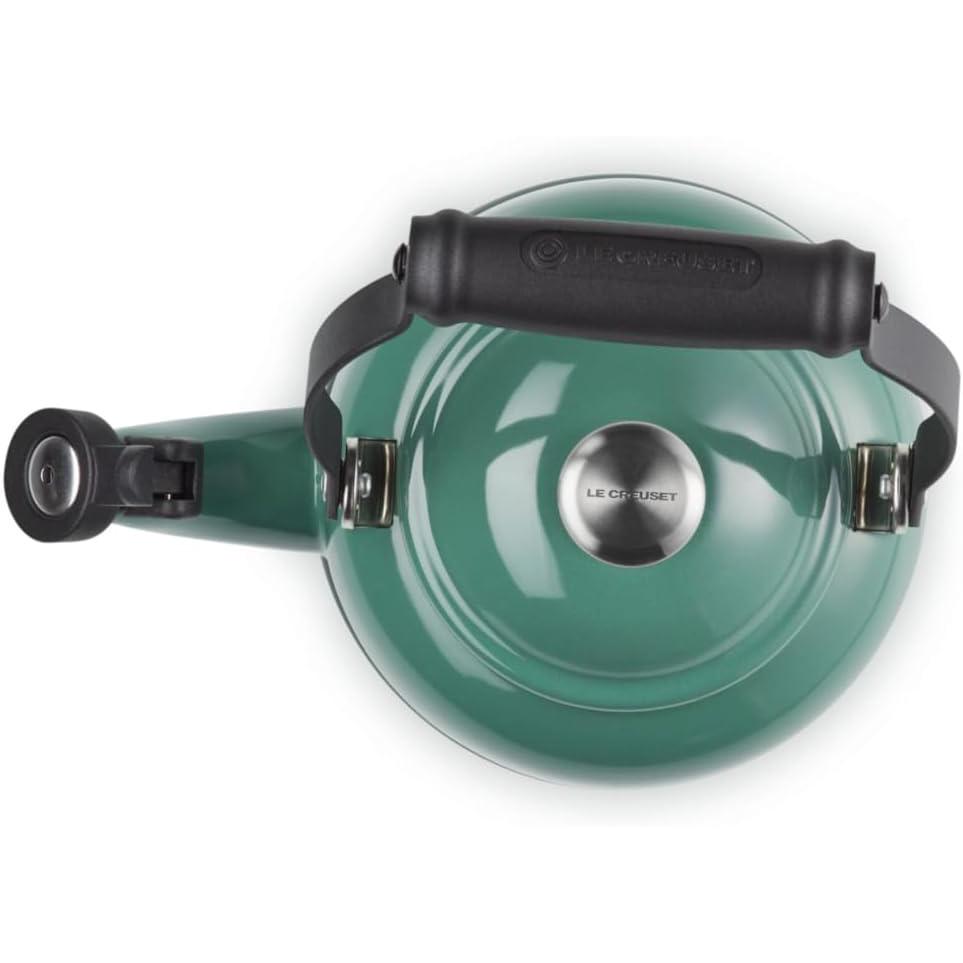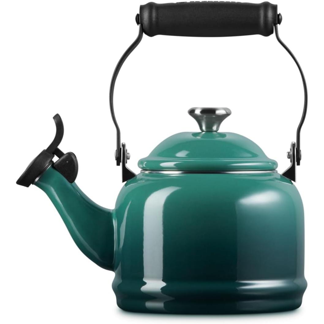 Traditional styling combined with modern materials and gorgeous colors make the Le Creuset demi teakettles a welcome addition to any stovetop. Ther unique, locking handles and phenolic knobs make lifting, pouring and cleaning easy. The carbon-steel construction ensures rapid heat conudction on any stovetop, including magnetic induction. 1.25-qt. capacity with a whistle alert when the water boils.