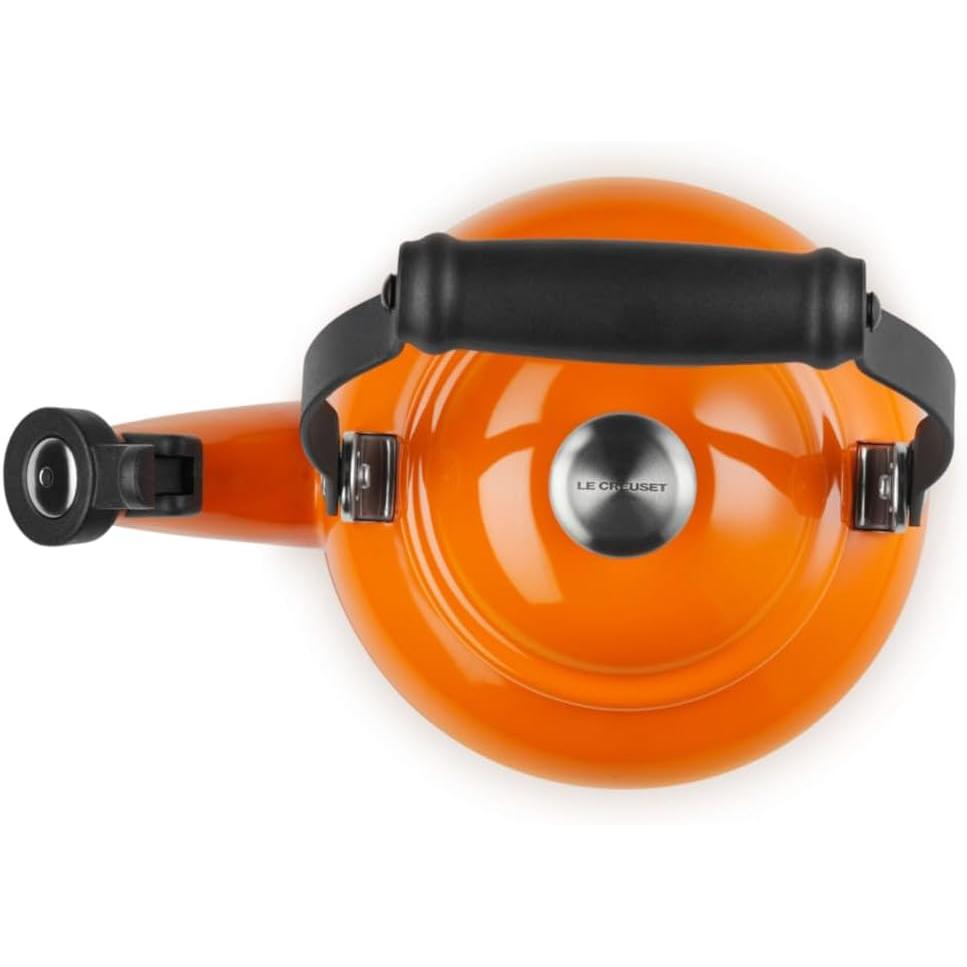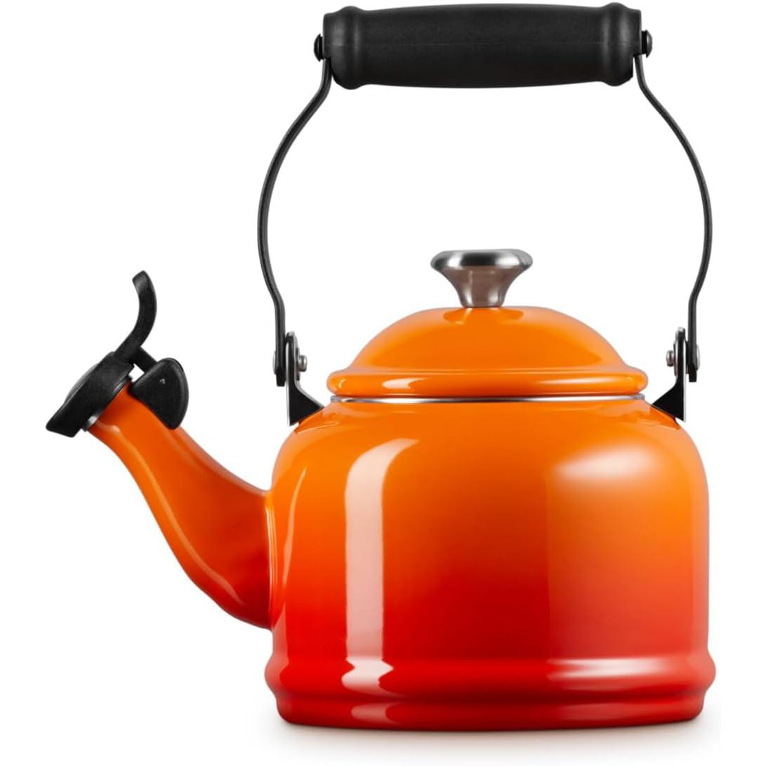 Traditional styling combined with modern materials and gorgeous colors make the Le Creuset demi teakettles a welcome addition to any stovetop. Ther unique, locking handles and phenolic knobs make lifting, pouring and cleaning easy. The carbon-steel construction ensures rapid heat conudction on any stovetop, including magnetic induction. 1.25-qt. capacity with a whistle alert when the water boils.