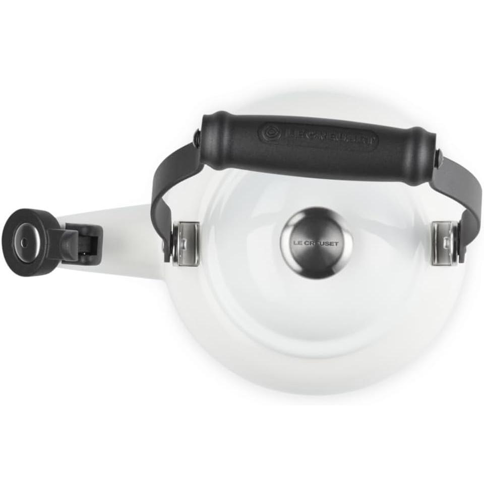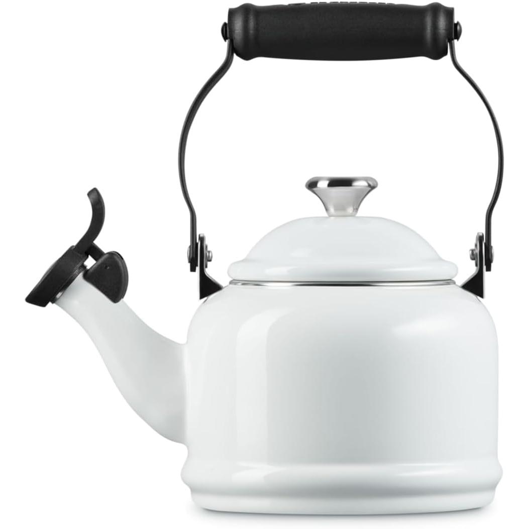 Traditional styling combined with modern materials and gorgeous colors make the Le Creuset demi teakettles a welcome addition to any stovetop. Ther unique, locking handles and phenolic knobs make lifting, pouring and cleaning easy. The carbon-steel construction ensures rapid heat conudction on any stovetop, including magnetic induction. 1.25-qt. capacity with a whistle alert when the water boils.