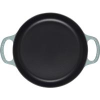Le Creuset's enameled cast iron Everyday Pan has a wide surface area that is perfect for everything from pan roasting and frying, to one pan meals, simmering sauces and more; it essentially combines the benefits of a braiser with the ease of use of a fry or sauté pan. Slightly curved sides make it easy to stir, flip and serve, while oversized handles provide a secure grip for transferring from stove to oven to table. The Everyday Pan measures 11" in diameter and 2.5" high and has a capacity of 3.4 qts. Crafted from Le Creuset's legendary enameled cast iron, the interior surface is finished with a black satin enamel that eliminates the need for the traditional seasoning and maintenance of raw cast iron. The enamel is specially formulated to enhance cooking performance, and develops a natural patina over time making it virtually nonstick and easier to maintain and clean.