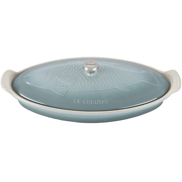 Le Creuset's fish baker is a covered ceramic baking dish embossed with an elegant fish motif and topped by brushed gold-finish knob. A striking presentation from oven to table, it’s perfect not only for baking, roasting, steaming, and broiling all manner of fish recipes, but also for roasting and steaming vegetables and meat, baking casseroles, one dish meals and more. The ridges on the bottom of the baking dish keep food elevated for even cooking and browning, while the stoneware lid locks in moisture and keeps fish odors contained. The fish baker measures 13.5" long including the handles, and has a capacity of 1.7 qts.