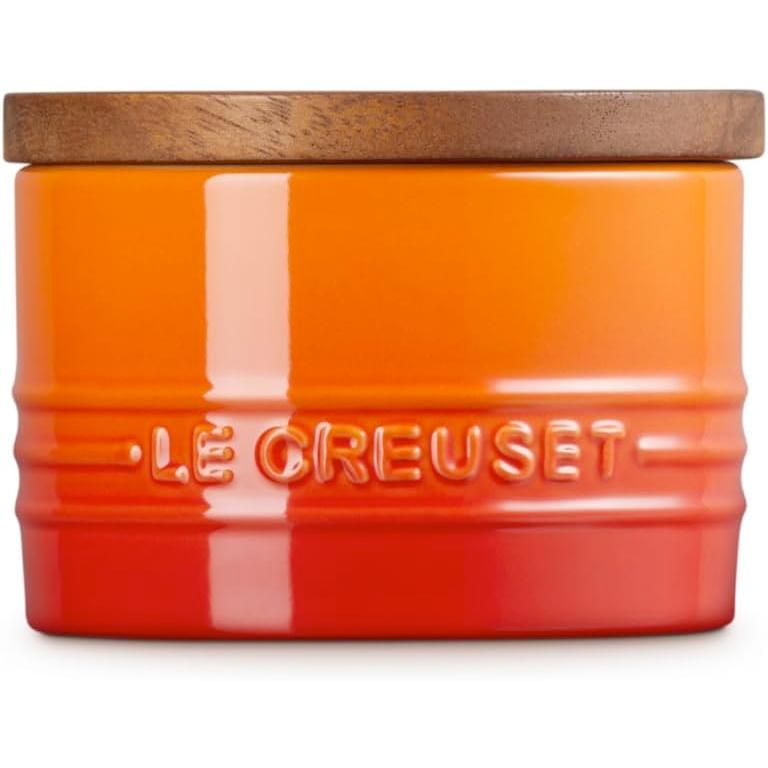 Made of rugged Le Creuset stoneware, this 7-oz. salt cellar features a solid acacia lid with an airtight silicone seal. The colorful glaze is nonporous, non-reactive and resistant to chips, scratches and stains, plus it matches Le Creuset cookware and bakeware. The ceramic cellar is dishwasher-safe, the lid is hand wash only.