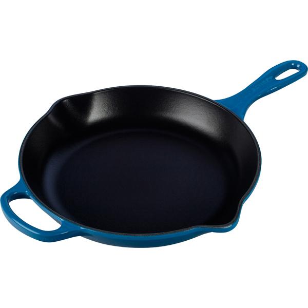 This beautiful cast-iron skillet, with it's colorful enamel finish, is ideal for use on the stovetop or in the oven, and is ideal for magnetic induction cooking. The interior is also enamel, with a textured, matte-black finish. Hand wash only.