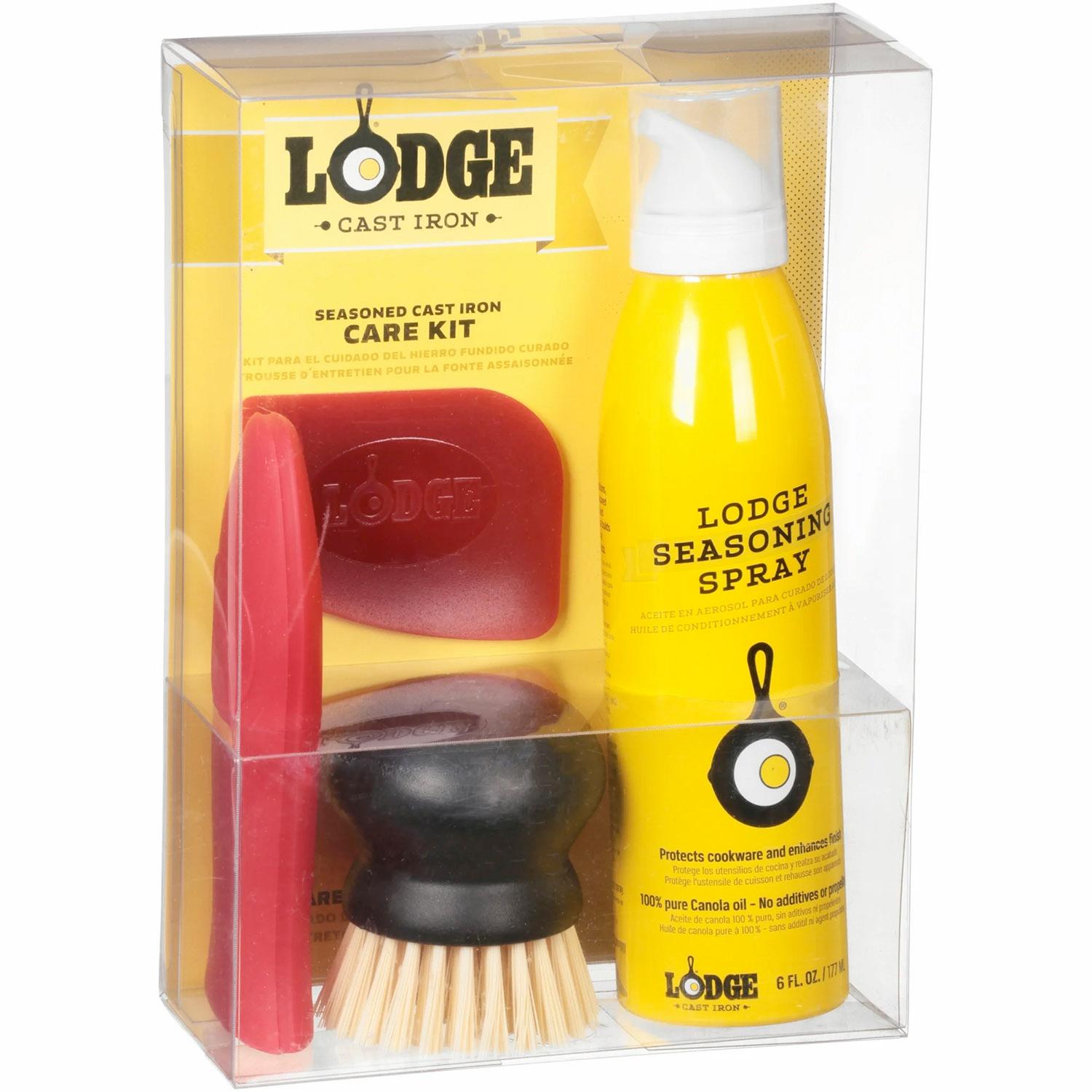 Here are all the essentials you need to enjoy and care for your cast iron cookware. There’s a scrub brush with stiff nylon bristles to remove cooked-on food, a pan scraper with an assortment of angles to get into nooks and crannies, a silicone handle holder that’s safe up to 500° F, and a bottle of 100% canola oil seasoning spray to enhance the finish of cast-iron pans.