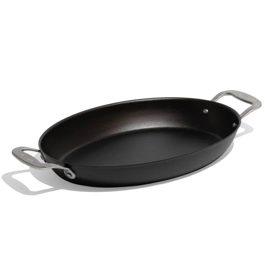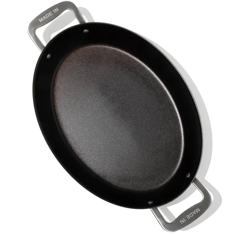 The 14" carbon steel oval gratin delivers the high-heat performance of cast iron with the speed and control of stainless steel. Responsively engineered for roasting vegetables, crisping fish, or browning gratins, it’s a versatile piece built for both everyday meals and entertaining, on the stovetop or in the oven. Pre-seasoned with a blend of shea nut and coconut oil, it arrives ready to cook and naturally non-stick from the first use. Sloped walls and a wide oval surface provide generous space for layering ingredients or accommodating large cuts of meat, while dual stay-cool handles make for easy maneuvering in and out of the oven. Designed to go seamlessly from oven to table, the oval gratin combines durability, beauty, and performance in one essential roasting pan.