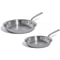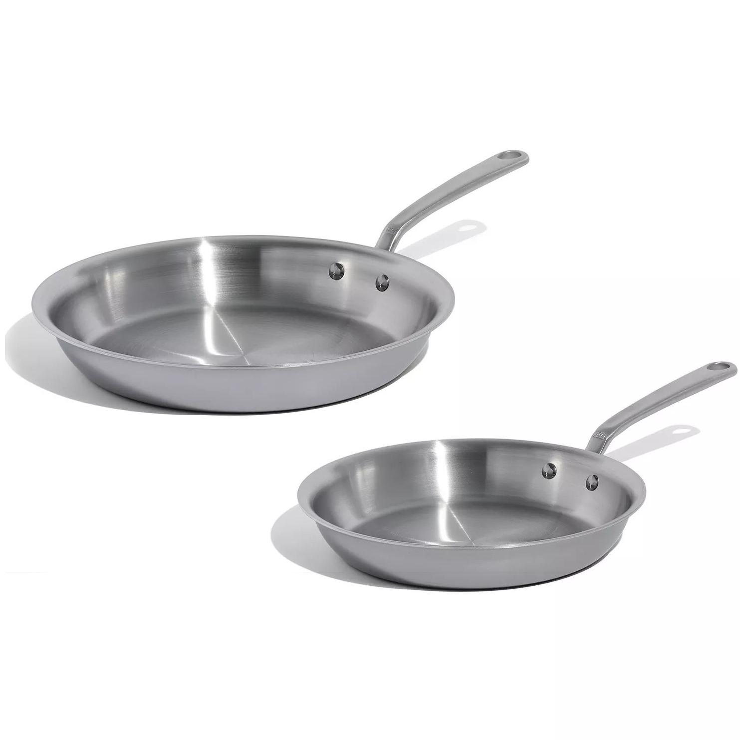 The two most useful frypan sizes in one money-saving package. Made In stainless-steel cookware is made in Italy out of 5 layers of clad metals, featuring a pure aluminum core for rapid, uniform heat conduction. The cooking surfaces and the exterior are stainless steel, as are the proprietary, stay-cool handles. Made In stainless-steel cookware performs superbly on gas, electric, magnetic induction, and ceramic stovetops, and is oven-safe to 800° F. It's also dishwasher safe.