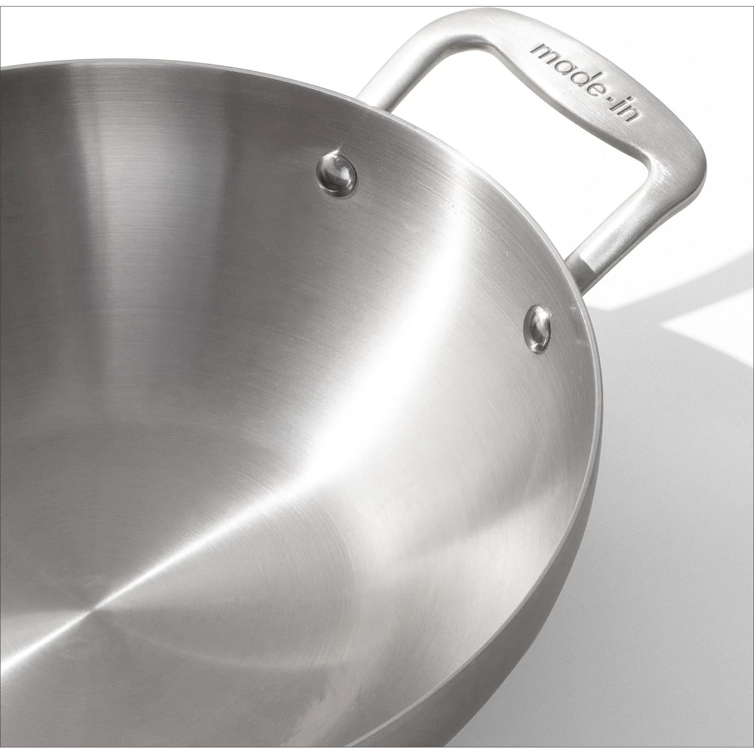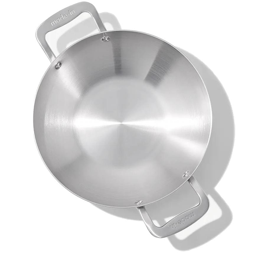 A staple piece of cookware in South Asian cuisines, the kadai is a versatile pan that has been used in various iterations for centuries. Featuring high walls, a flat base, and distinctive looped handles on either side, the kadai makes for easy stirring or tossing—ideal for sauce-based meals like curry or ones that require frequent agitation, like stir-fries. The sloped walls make for easy stirring without fear of ingredients getting stuck in corners, while the large, deep volume allows for the building of flavor in sauce-based dishes, or the ability to deep-fry treats like samosas. A flat base means ingredients have complete contact with the cooking surface, perfect for sears and sautes. 3-qt. capacity, 10.5” diameter (14.5” through the handles), 3.25” high. The Made In kadai is made in Thailand out of 5 layers of clad metals, featuring a pure aluminum core for rapid, uniform heat conduction. The cooking surface and the exterior are stainless steel. Made In stainless-steel cookware performs superbly on gas, electric, magnetic induction, and ceramic stovetops, and is oven-safe to 800° F. It's also dishwasher safe.