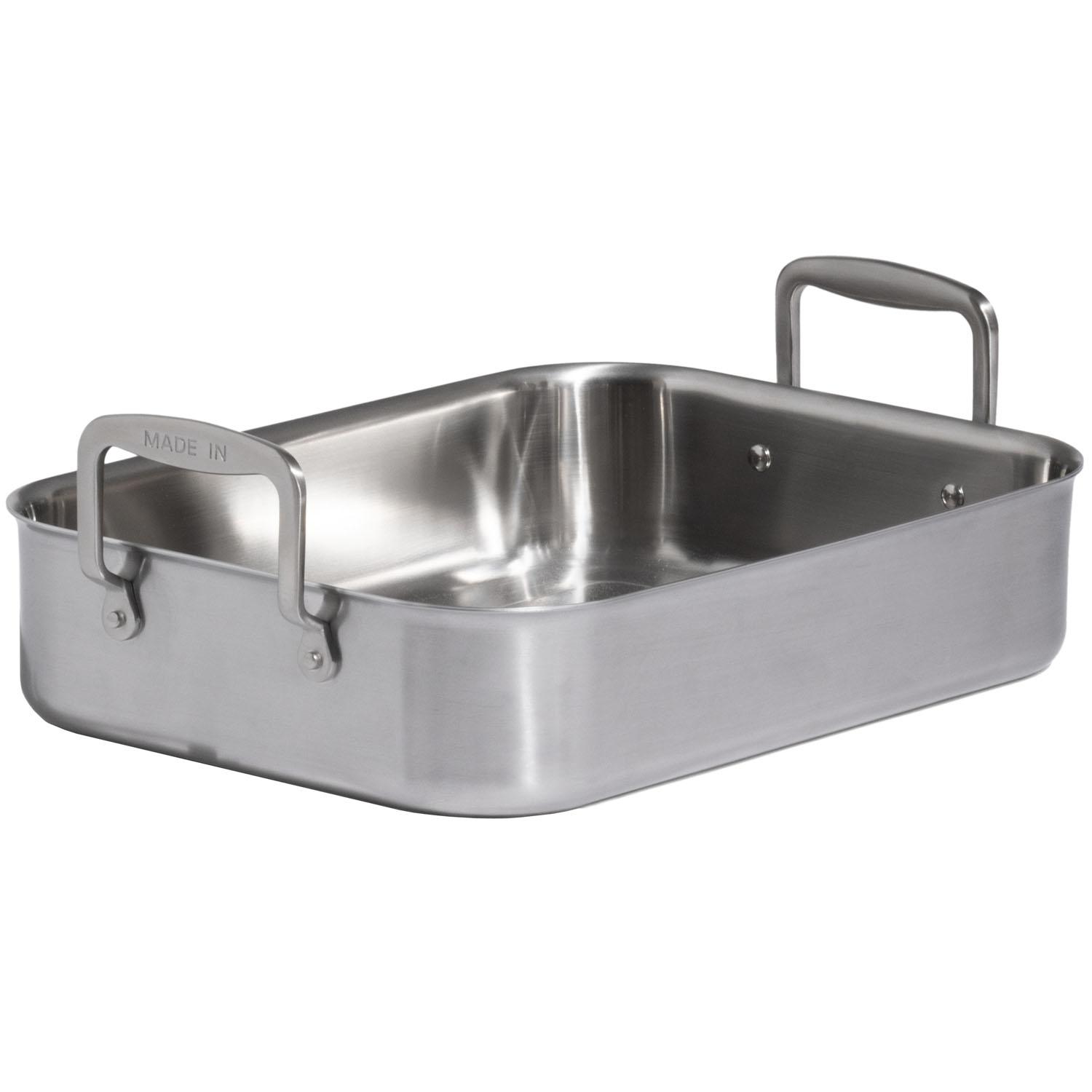 The Made In stainless-steel roasting pan is made in Italy out of 3 layers of clad metals, featuring a pure aluminum core for rapid, uniform heat conduction. The interior and exterior of the pan are stainless steel, as are the extra-large, loop handles. Big enough to hold a 24-lb. turkey, the Made In roasting pan measures 18.35" x 12.5" and comes with a U-shaped, stainless-steel roasting rack that elevates food above fat and juices. Made In stainless-steel cookware performs superbly in the oven up to 800° F, and on gas, electric, magnetic induction, and ceramic stovetops. It's also dishwasher safe.