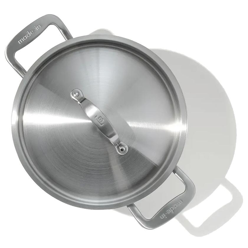 Made In stainless-steel cookware is made in Italy out of 5 layers of clad metals, featuring a pure aluminum core for rapid, uniform heat conduction. The cooking surfaces and the exterior are stainless steel, as are the proprietary, stay-cool handles. Made In stainless-steel cookware performs superbly on gas, electric, magnetic induction, and ceramic stovetops, and is oven-safe to 800° F. It's also dishwasher safe.