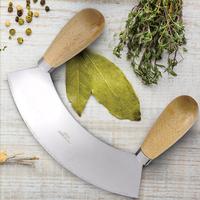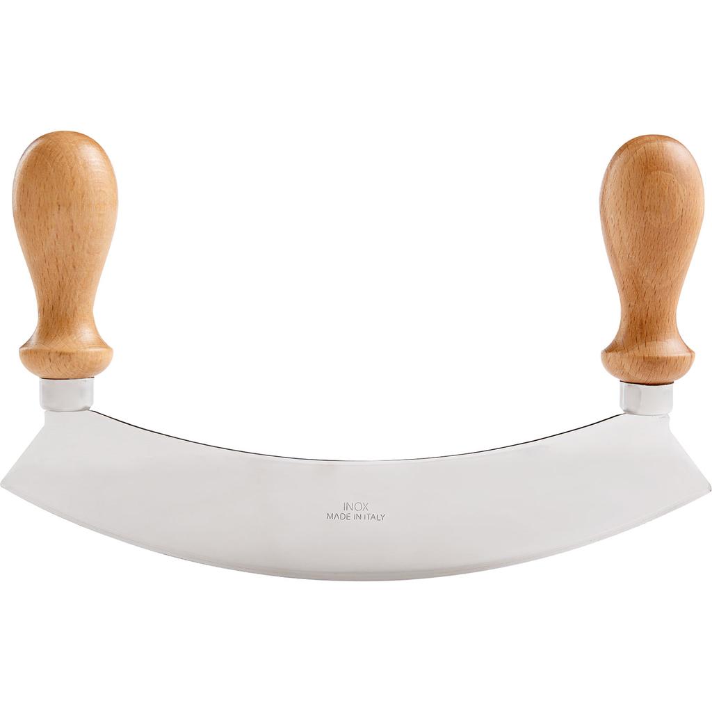 Made in Italy, this classic mezzaluna, or half-moon, is ideal for chopping garlic, herbs, fruit, vegetables, and leafy greens, and for cutting pizza and block chocolate. Simply rock the blade side-to-side to chop tender items such as greens and herbs, and use an up-and-down motion to chop denser foods, continuing until you achieve your desired texture. The stainless-steel blade measures 9.5" and the twin beech handles provide a secure, comfortable grip. Hand wash only.