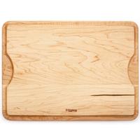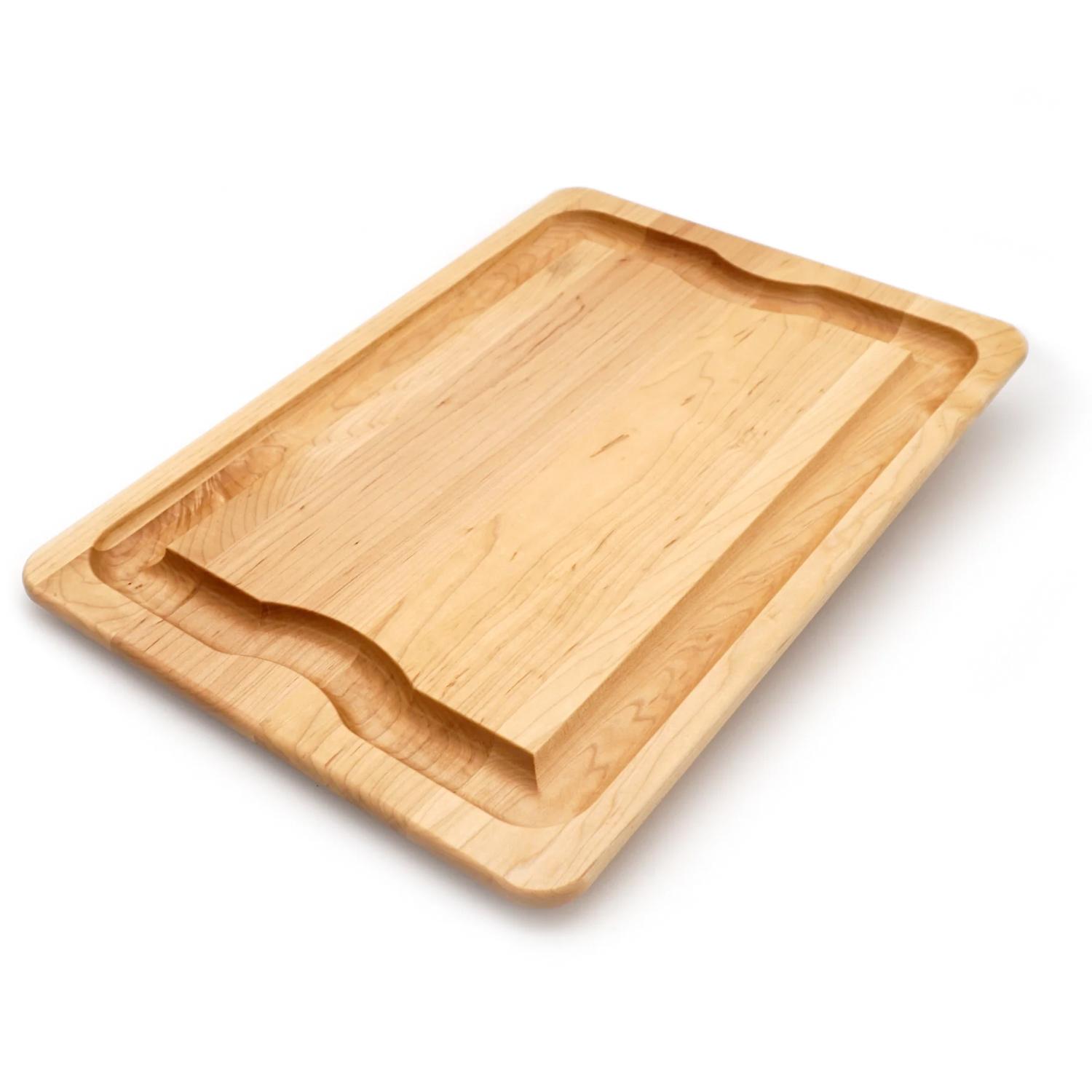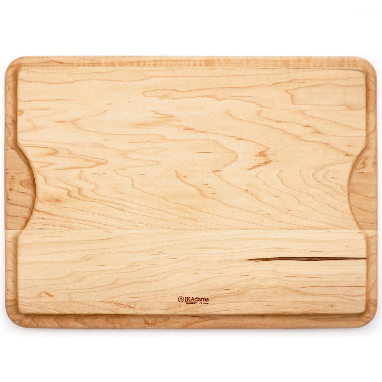 Made in Vermont by J.K. Adams, this solid-maple board is ideal for retreiving meat from the grill or bringing a roast to the table thanks to the undercut handles which make carrying easy and secure. The large flat surface is perfect for carving meat or poultry, while the wide groove collects juices and keeps your counter or table neat and clean. 20" x 14" with J.K. Adams' mineral oil and beewax finish.