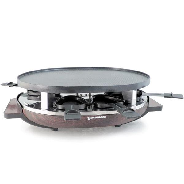 Try a fun and engaging raclette dinner with this beautiful, non-stick raclette grill. Raclette originated in parts of Switzerland and the Savoy region of France. Raclette cheese is heated, then scraped onto diners' plates; the term raclette derives from the French verb racler, meaning "to scrape". Traditionally, it is accompanied by small firm potatoes, gherkins, pickled onions, and dried meat. Mentions of raclette date back to medieval times, but a modern raclette dinner involves an electric table-top grill with a heating element that melts cheese below, and cooks meat and vegetables on the elevated non-stick top. It includes small pans, known as coupelles, for heating the raclette cheese. The cheese is brought to the table sliced, accompanied by platters of boiled or steamed potatoes, other vegetables and charcuterie. These are then mixed with potatoes and topped with cheese in the small, wedge-shaped coupelles, then placed under the grill to melt and brown the cheese.