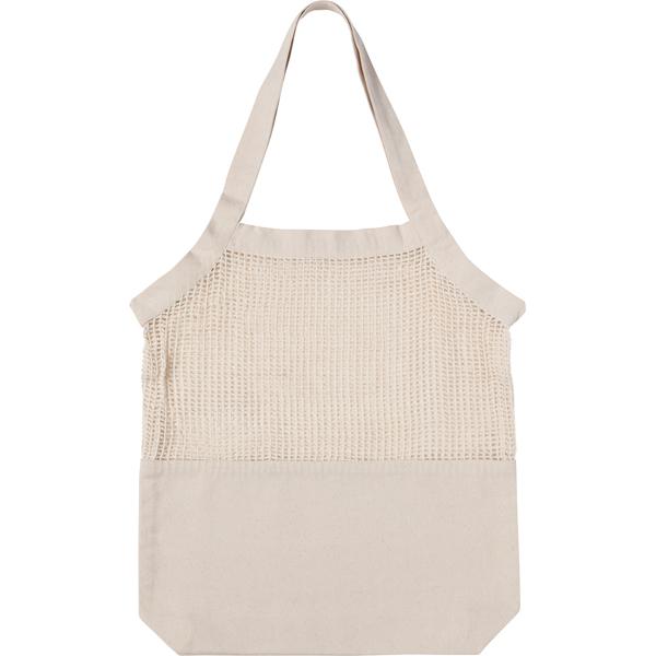 A great all-around tote bag that features a solid canvas bottom and a mesh string top. It's 100% cotton and measures 28" x 16". Machine wash in cold water and hang up to dry.