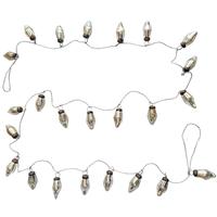 Shaped light vintage tree lights and finished in reflective silver, each of the 24 mercury glass ornaments measures 1.5” tall. They’re attached to a silver cord that measures 72” long.