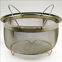 Here's the perfect thing for steaming inside your electirc multi-cooker! This 8.25"-dia. basket is made of stainless steel and fits inside multi-cookers, or other pans, with 9.5"-dia. cooking inserts. It's easy to put in and take out of the pot, thanks to the dual handles which fold neatly out of the way. The basket has a capacity of 3 qts. and measures 4.75: tall on the feet which keep the basket slightly elevated and the contents out of the steaming liquid. It also makes a great strainer or colander. Dishwasher safe.